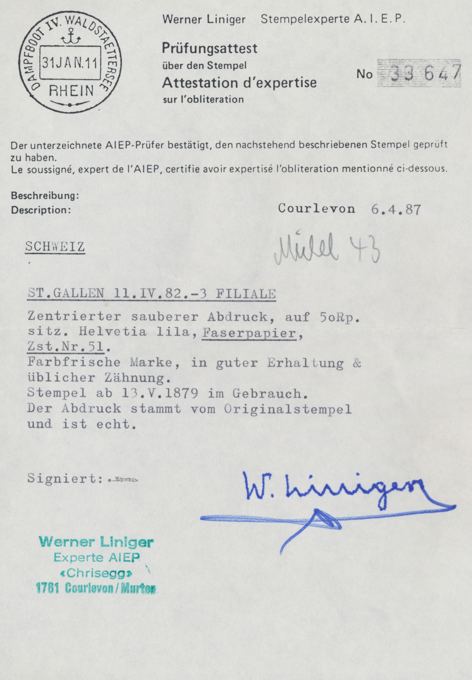 1882 'Ziffern' auf weißem Papier, 2 Rp. mit Zertifikat Raybaudi(1981), dazu 10, 12 und 15 Rp., alle sauber gestempelt. (Mi. ca. 750,- €)