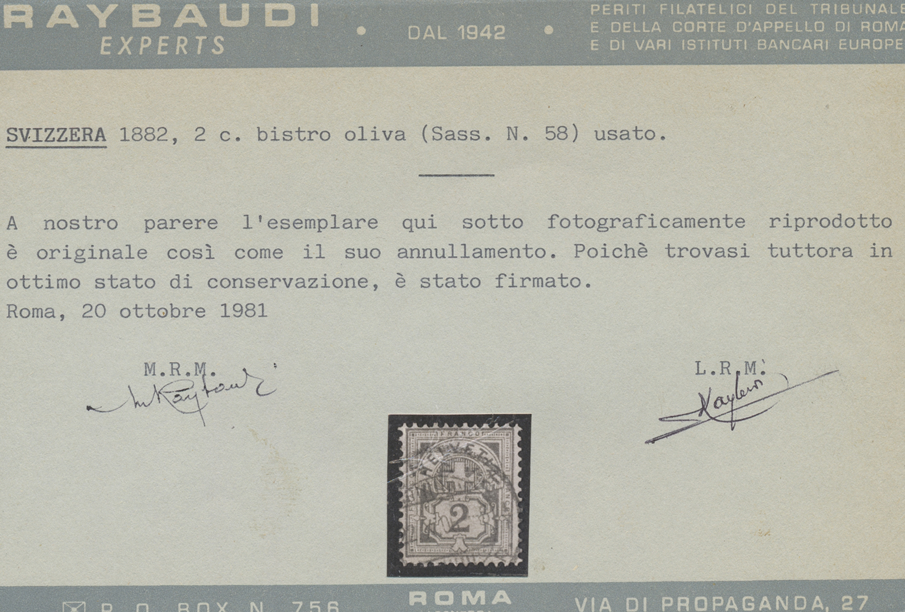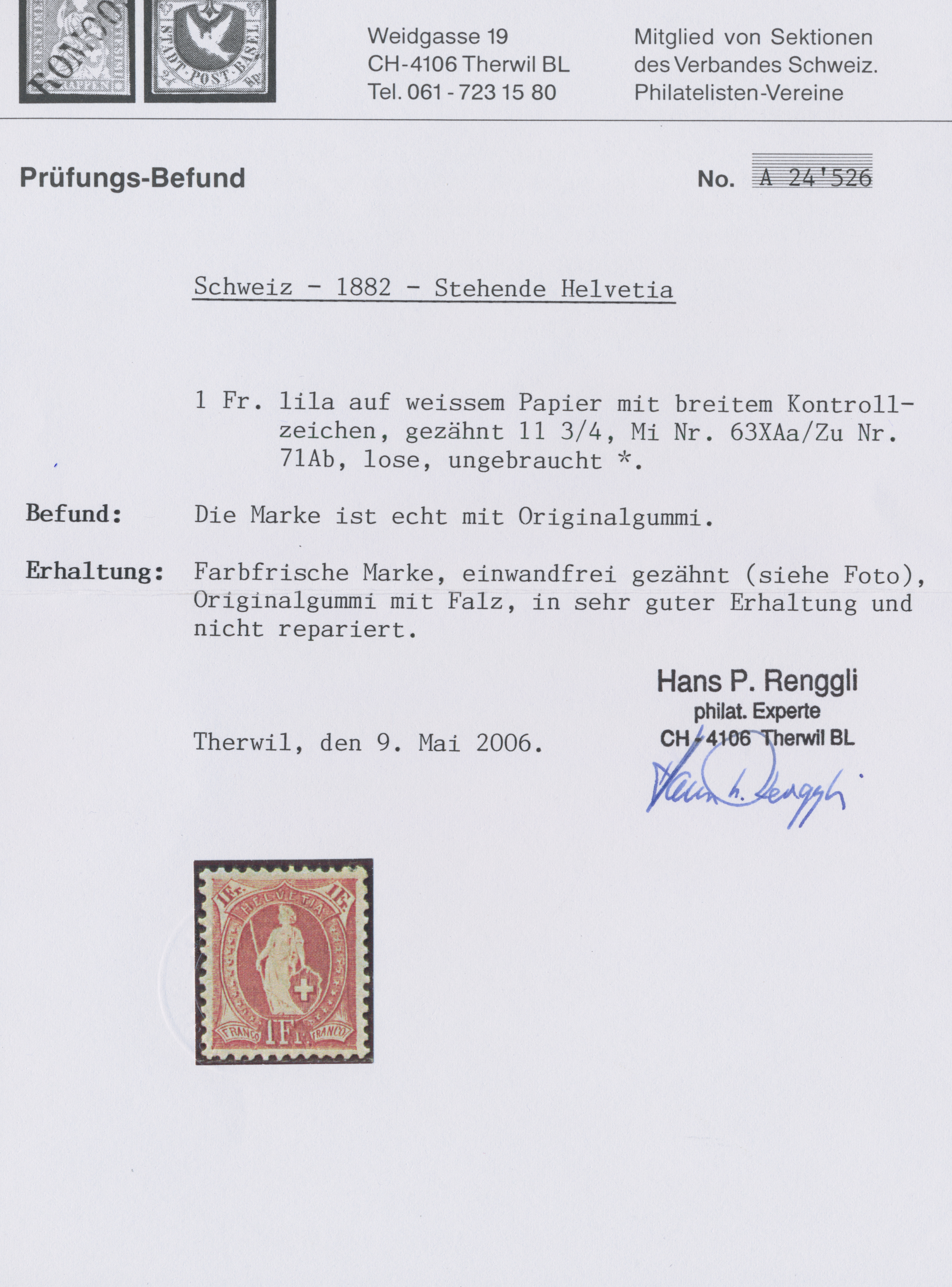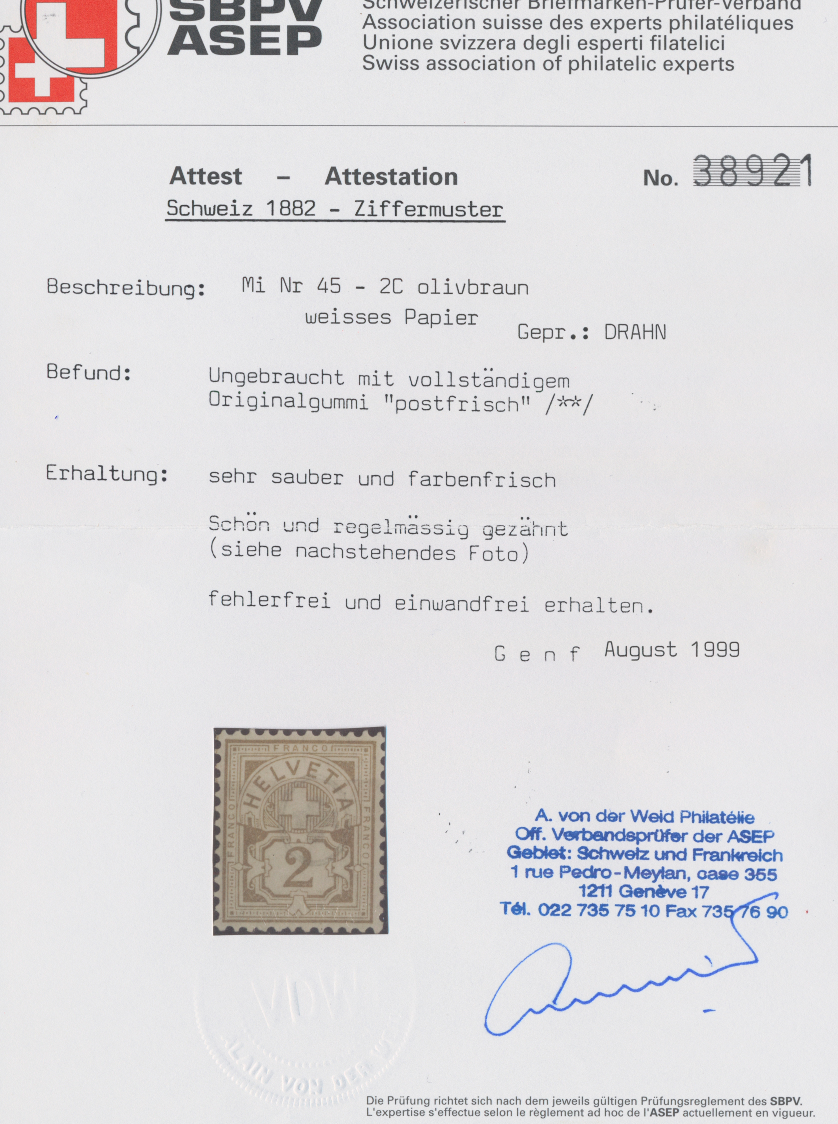 1882 Ziffern 2 Rp. olivbraun auf weißem Papier, POSTFRISCH, in sehr guter Erhaltung. Attest v.d.Weid. (Mi. 800,- €)