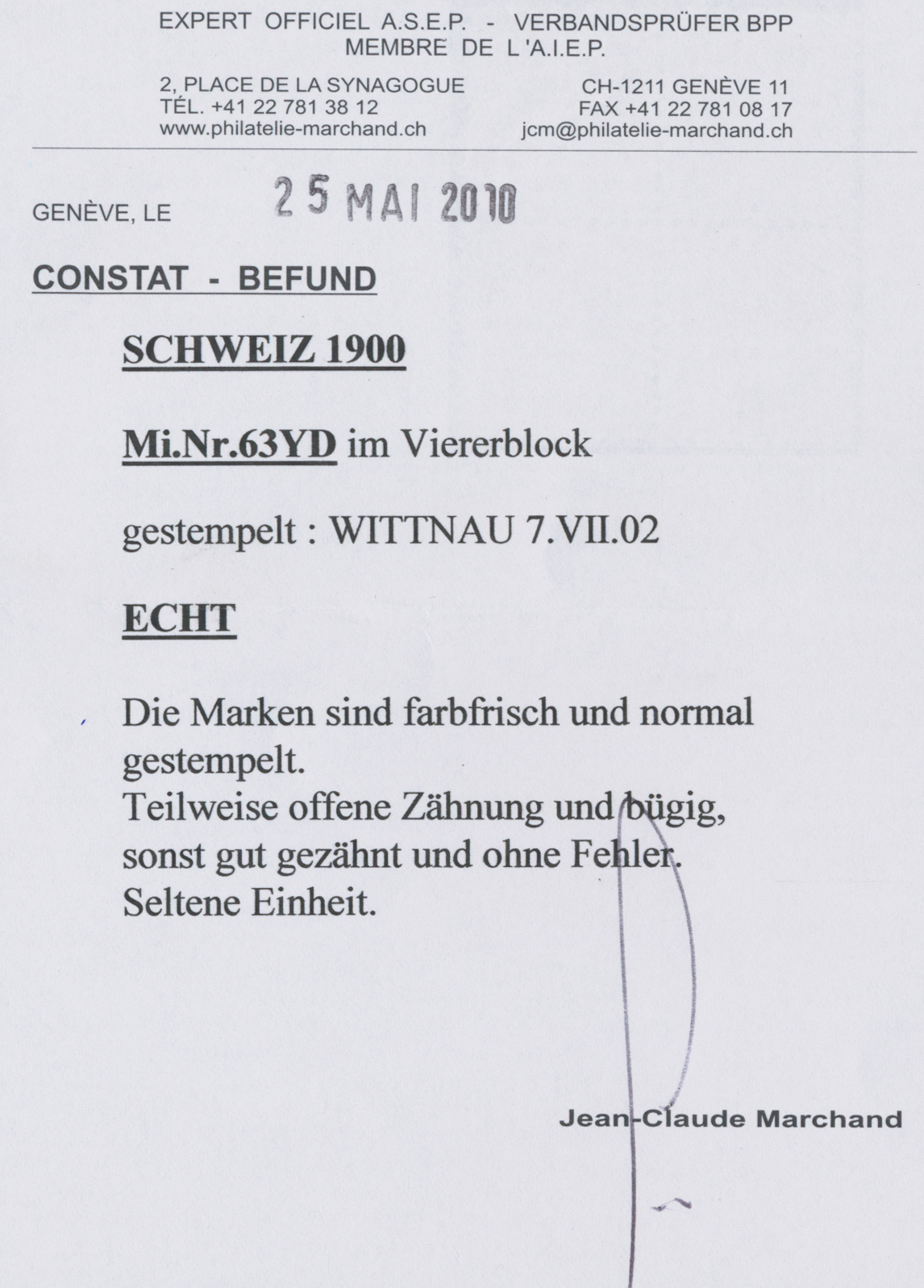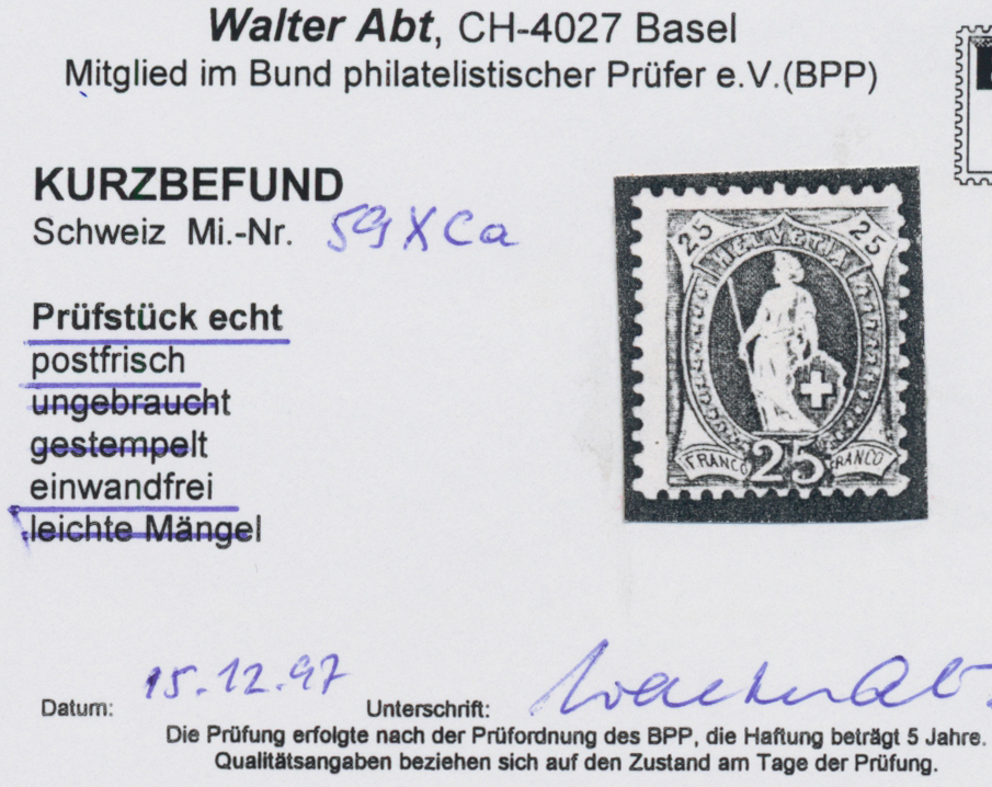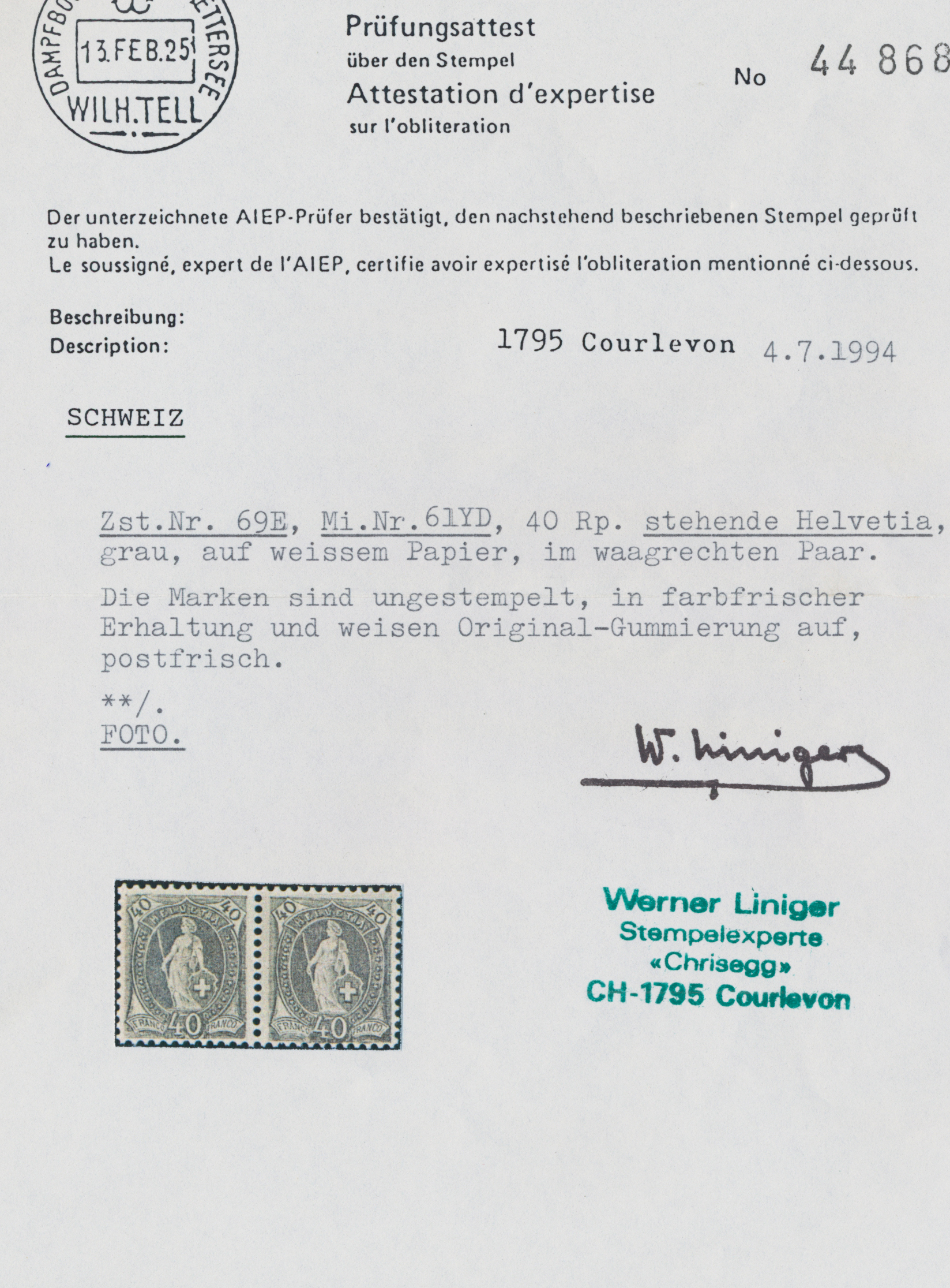 die 4 Schlüsselwerte (15 Rp., 40 Rp., 50 Rp. und 1 Fr.) je mit Attest (v.d.Weid, Renggli und 2x Liniger). (Mi. 5400,- €)