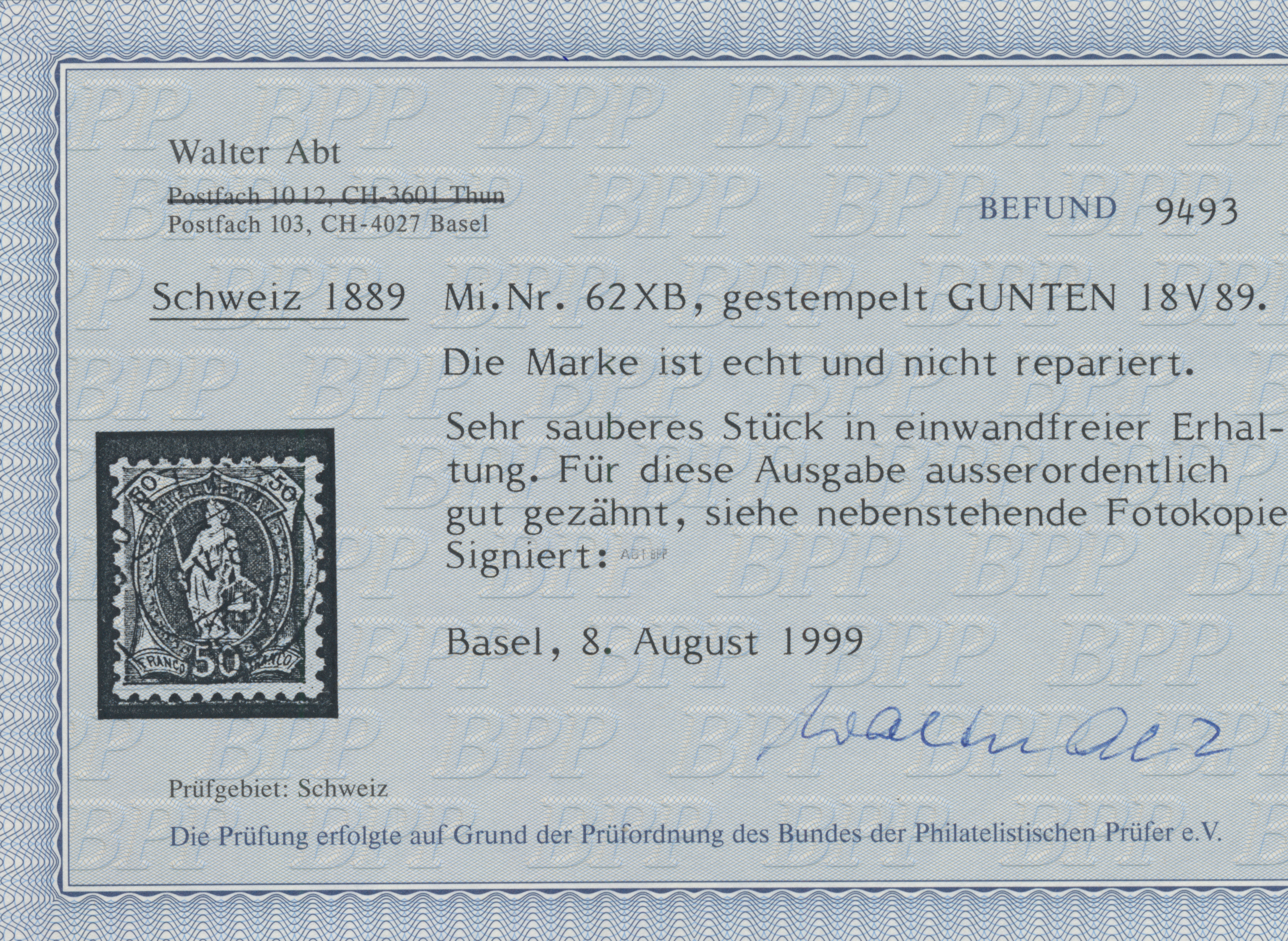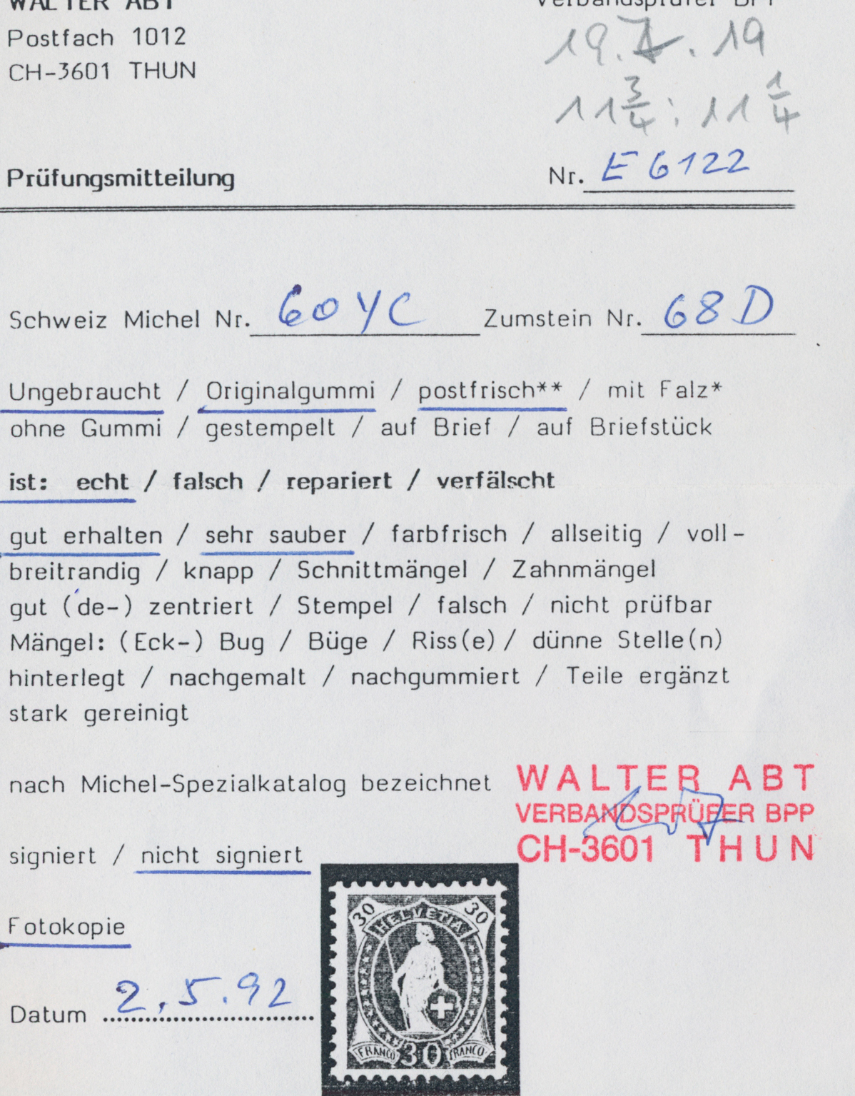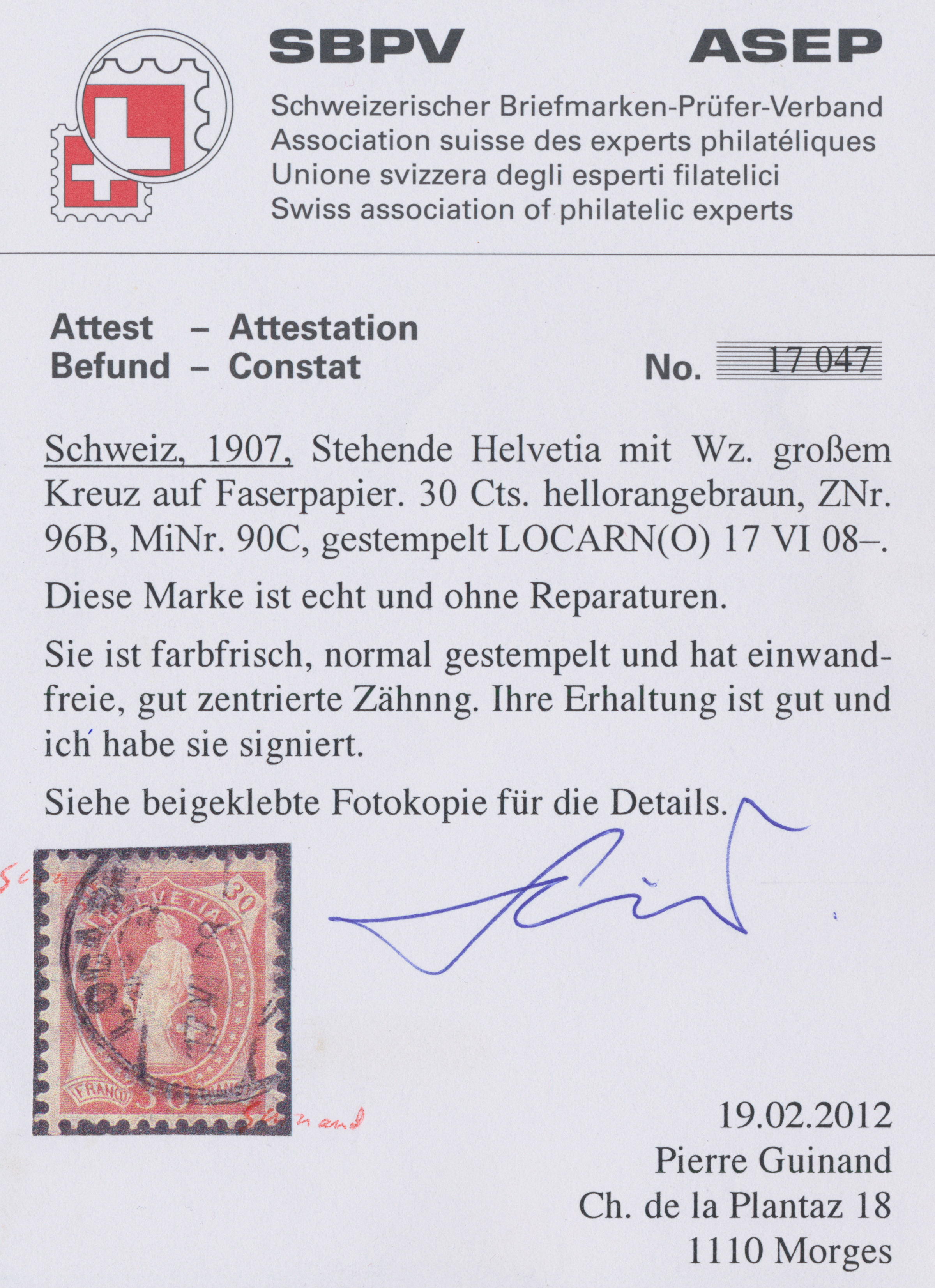 1900-1907 Zwei bessere Marken Stehende Helvetia gestempelt: 3 Fr. mit Wz. (weißes Papier) und gez. 11½:12 (80D) sowie 30 Rp. auf Faserpapier in Zhg. 11½:11 (Befund