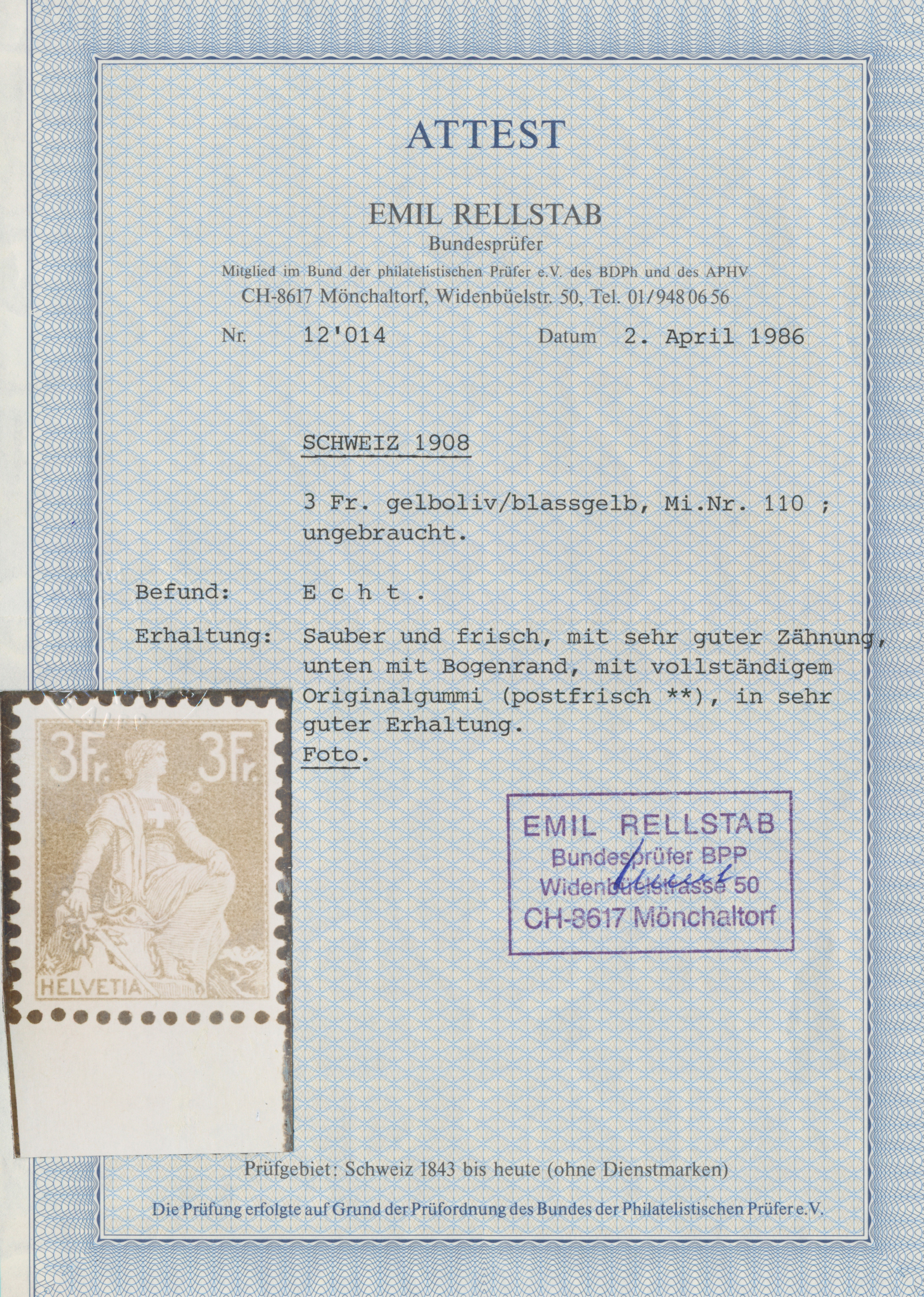 1908 3 Fr. mit Bogenrand unten sowie 70 Rp. jeweils tadellos postfrisch. Attest Rellstab für 3 Fr. (Mi. 1200,- €)