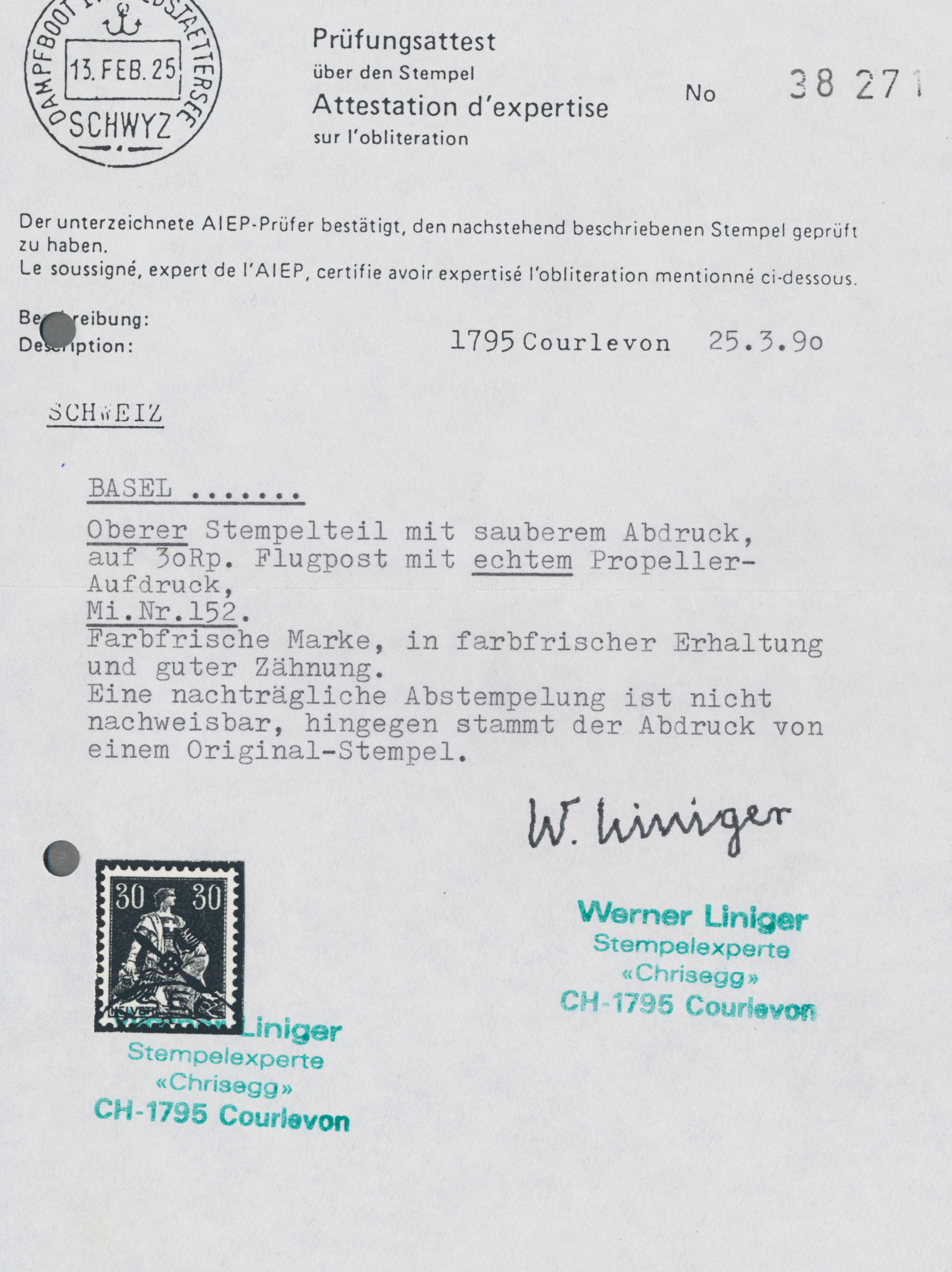 1919-20 Flugpost 30 Rp. und 50 Rp. je mit Propelleraufdruck, sauber gestempelt, 30 Rp. mit Attest Liniger. (Mi. 1540,- €)