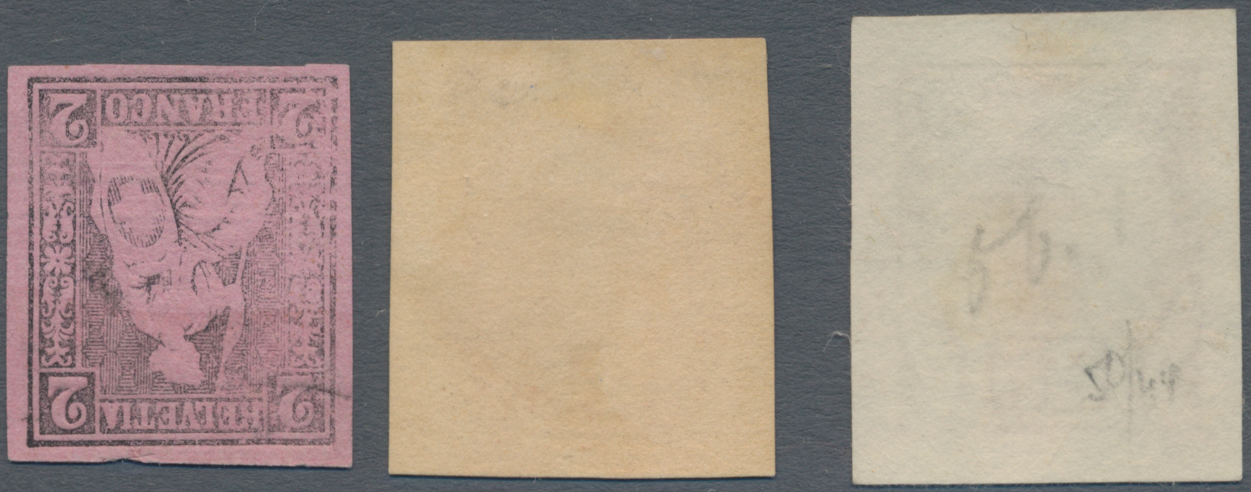 1880/1900 (ca.): Drei Essays, mit 'sitzender Helvetia' 2 Rp. schwarz auf lilarosa mit zweitem, verschobenem Druck rückseitig sowie zwei verschiedenen Rütli-Essays.