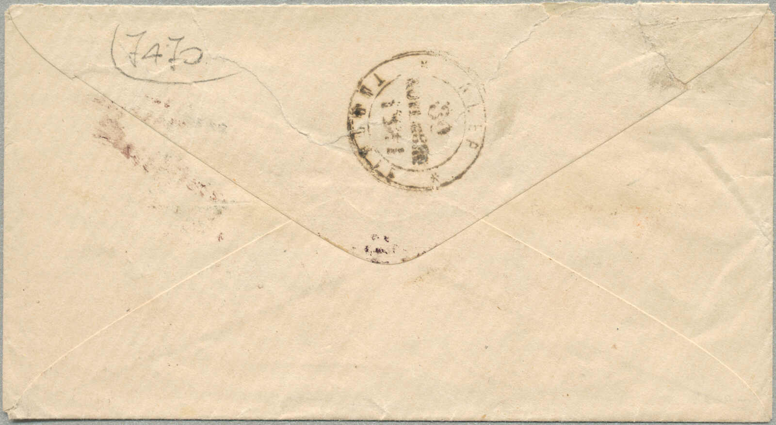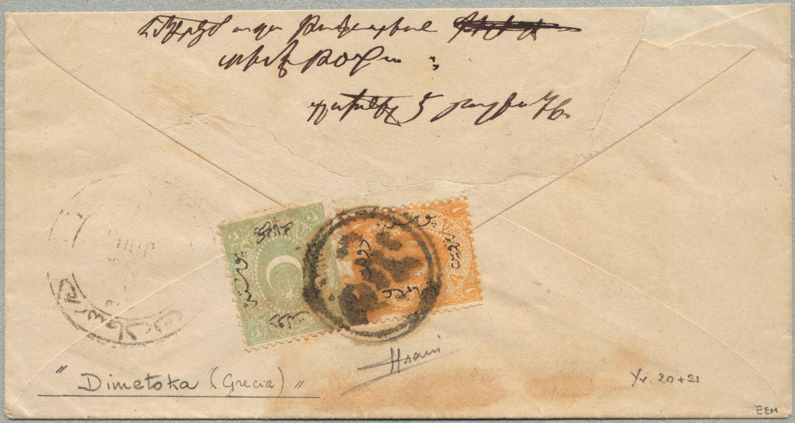2608 on cover 21.4 image1874-5, from Dimetoka (Ottoman Thrace), envelope franked with 20 para orange and 1 piastre green Ottoman Tughra issue stamps, both tied by double-circle DIMETOKA postmark in Arabic, second Ottoman circular marking on reverse possibly transit or arrival, pencil signature on reverse by philatelic expert writing in Sorani, handwritten bilingual address, rare mixed franking representing higher-rate postage possibly for registered or foreign destination, scarce usage from multi-ethnic region of Western Thrace during final Ottoman decades, expert-signed example adding philatelic value and provenance, VF! Estimate 400€.