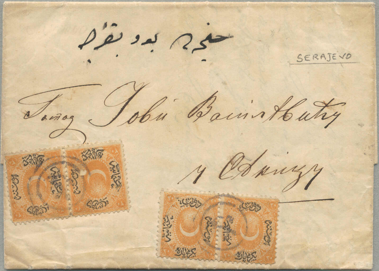2607 on cover 9 image1868, from Sarajevo to Odessa, letter franked with (4) examples of the 20 para orange stamp, tied by clear concentric ring SARAYBOSNA date cancellations, total franking 80 para equaling 2 piastres, likely paying the double-weight international letter rate, routed overland via Constantinople and by Black Sea steamer to southern Russia, clean and attractive example of higher-rate commercial mail from Bosnia Eyalet to the Russian Empire, scarce usage with full franking from Ottoman Balkans, VF! Estimate 400€.