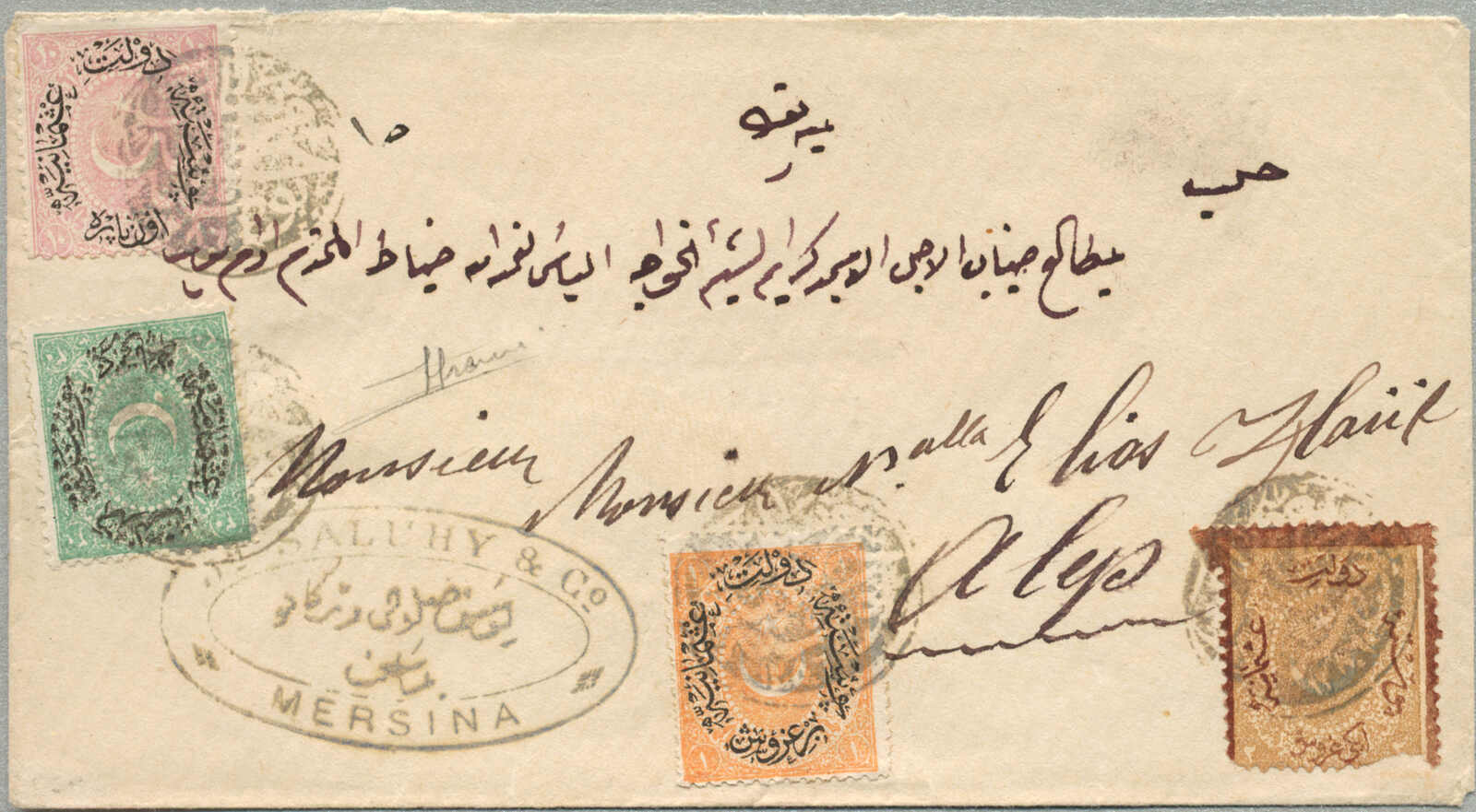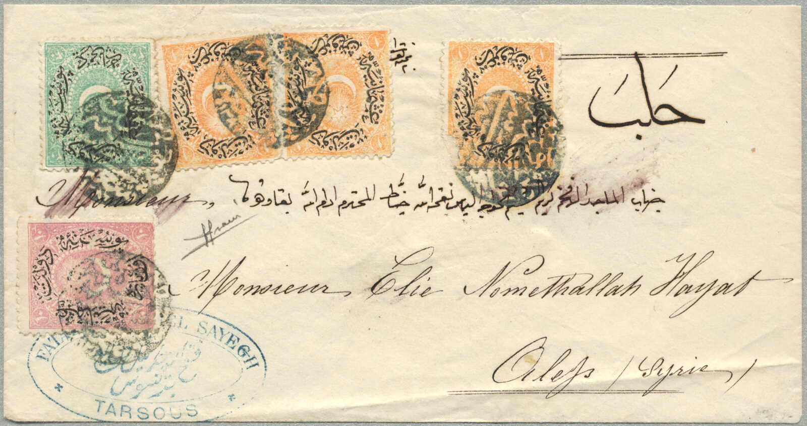 1881, von Tarsous nach Aleppo, Brief freigemacht mit 10 paras lila (Scott 42), 20 paras hellgrün (Scott 43), und drei 1 Piaster gelb (Scott 44), osmanisch Tughra Ausgabe Briefmarken übergehend gestempelt mit türkische Entwertungen, blauer ovaler Firmenstempel von Tarsous unten links Vorderseite, handgeschrieben Adresse in osmanisch türkische und lateinisches, rückseitig mit klare Ankunft Kreisdatumsstempel ALEP 30 November 1881, portogerecht multi-value internen Briefporto innerhalb das osmanisches Kaiserreich, selten Bedarfsverwendung mit vollem postalisch und Firma Dokumentation, Pracht! Schätzpreis 600 EUR.