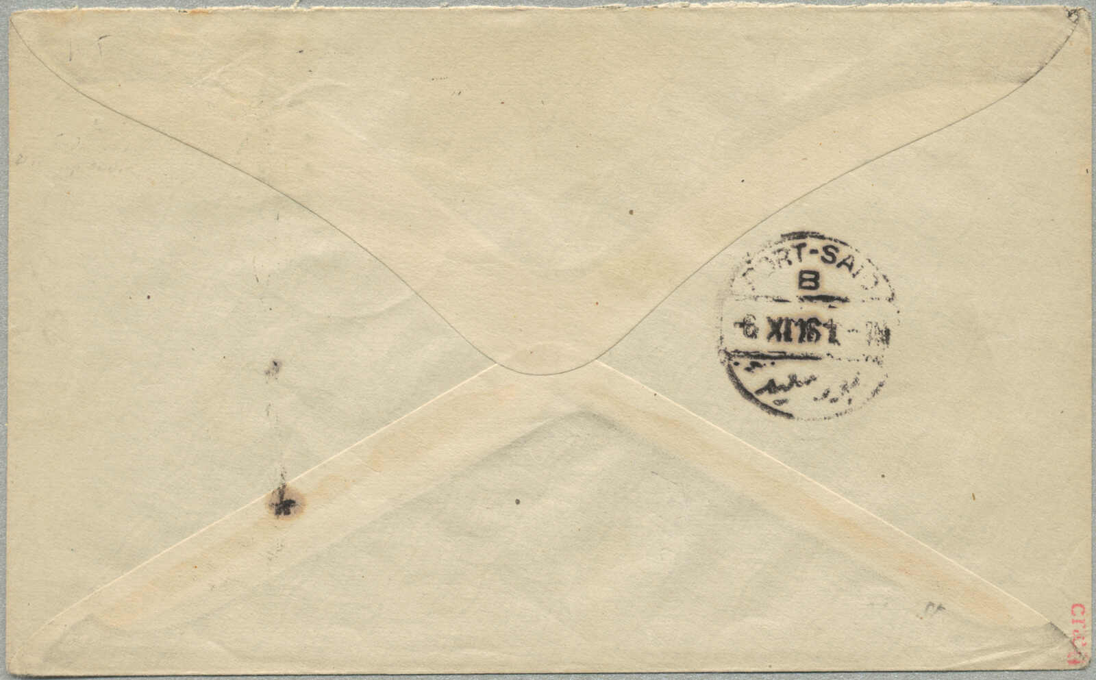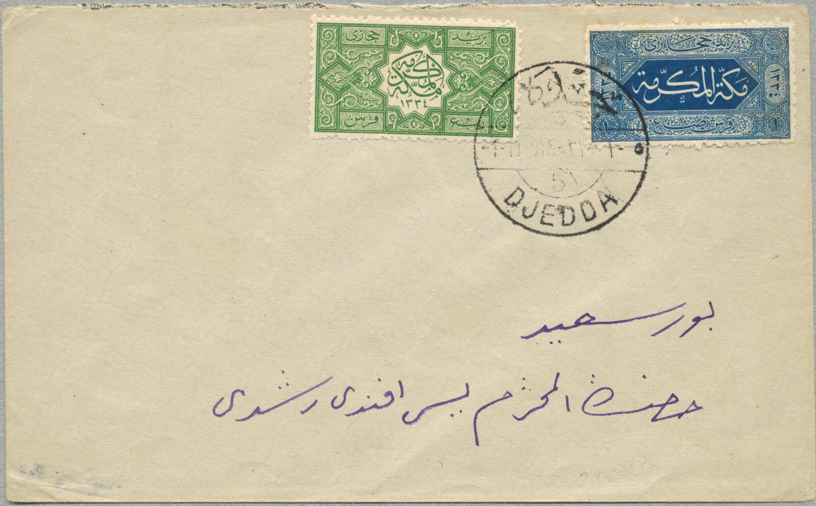 2614 on cover L10,12 image1917, from Jeddah to Port Said (Egypt), cover franked with 1/4 pi green and 1 pi blue Hejaz-Nejd stamps with ornate Arabic script, both cancelled by bilingual circular date stamp JEDDAH, arrival postmark PORT SAID on reverse side, handwritten Arabic address in violet ink, correctly franked for foreign letter rate to Egypt, rare destination outside the Arabian Peninsula, commercial usage from early Saudi postal period during reign of King Abdulaziz, clean and well-preserved example of cross-border mail from Hejaz region, VF! Estimate 500€.