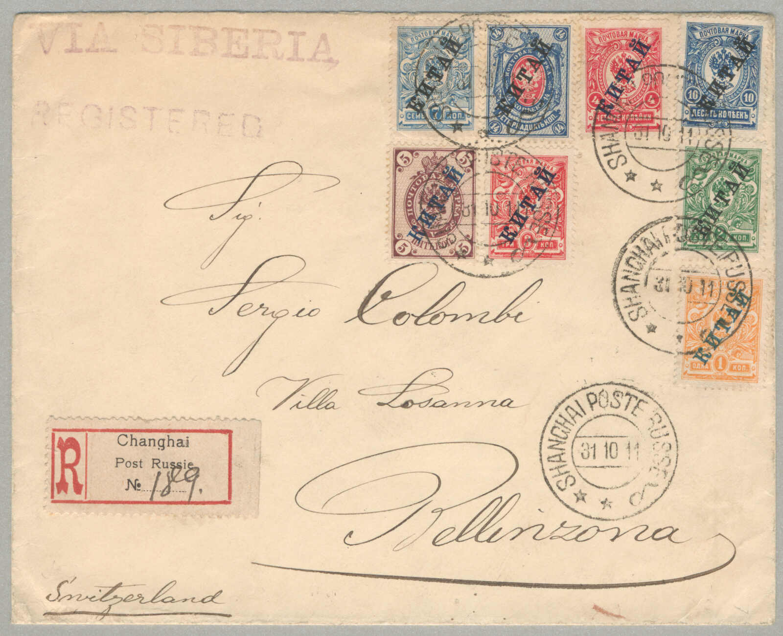 1911, ab russische Post in Shanghai zu Bellinzona, Schweiz, eingeschriebener Brief mit Vollfrankatur von 7 russische Post in China Ausgaben, alle mit KITAI Überdruck, Werten von 1 kopek zu 10 kopek, inklusive 10k Werten (blau und rot), alle gestempelt SHANGHAI POSTE RUSSE 31 10 11, große violett Einschreiben und über Sibirien Handstempel, rot und weiß Einschreibezettel Shanghai Post. Russe/Nr. 81, sauber, gut erhalten Brief nach Sergio Colombi, Villa Losanna, Bellinzona, an herausragendes Stück von sibirischen Briefweg Verwendung über Russland für schnell Übermittlung nach Europa, aufgegeben während der Höhe von russische handelsüblich und Militär Anwesenheit in China vor erster Weltkrieg und die zusammenklappen von kaiserlich beeinflussen, farbintensiv und begehrenswert complete-rate Frankatur, ex Kugel, Kabinett! Schätzpreis 800 EUR.