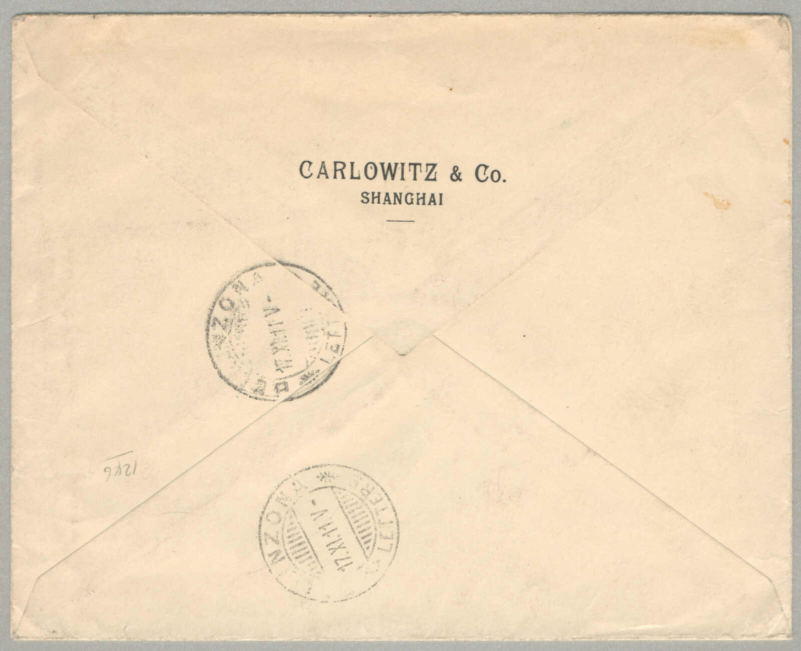 2602 on cover image1911, from Russian Post Office in Shanghai to Bellinzona, Switzerland, registered envelope with full franking of 7 Russian Offices in China issues, all bearing KITAI overprint, values from 1 kopek to 10 kopek, including 10k values (blue and red), all cancelled SHANGHAI POSTE RUSSE 31 10 11, large violet REGISTERED and VIA SIBERIA handstamps, red and white registration label Shanghai Post. Russe / No. 81, clean, well-preserved envelope to Sergio Colombi, Villa Losanna, Bellinzona, an excellent example of Siberian mail route usage via Russia for fast transmission to Europe, mailed during the height of Russian commercial and military presence in China before WWI and the collapse of imperial influence, colorful and desirable complete-rate franking, ex Kugel, XF! Estimate 800€.