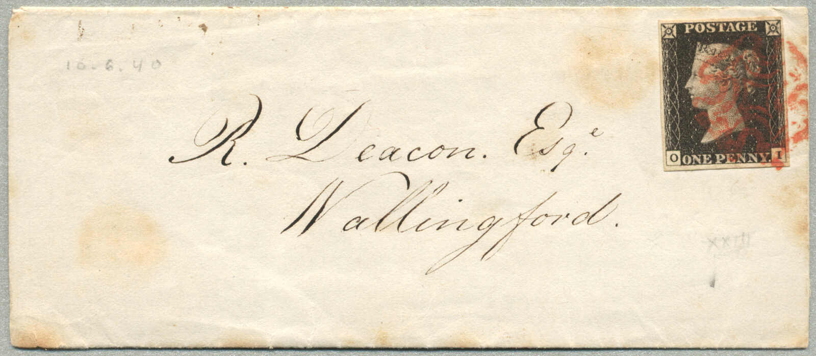 1840, von London nach Wallingford, Faltbrief freigemacht mit 1x 1 d schwarz Königin Victoria, Position QL, gestempelt mit rotem Malteserkreuz, rückseitig gestempelt LONDON 10 JU 1840 in schwarz, adressiert nach R Deacon Esq, frühe Juni Verwendung innerhalb die erste fünf Wochen nach dem Einführung des Black Penny auf 6 Mai 1840, Briefmarke mit vollem zu schmalrandig, Klassikers und höchst sammelwürdig first-issue Brief aus den frühen viktorianisch Postreform Aera, gute Ränder, einige Flecke, Pracht! Schätzpreis 800 EUR.