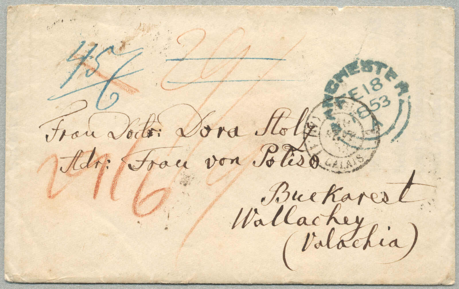 1853, ab Manchester nach Bukarest (Wallachia), markenloser Brief adressiert nach ein Edeldame, mit blau kreisförmig MANCHESTER FE 18 1853 Aufgabestempel und rot CALAIS Transitvermerk auf Vorderseite, mit Einheit durchstrichenen handschriftlich Taxierung Aufzeichnungen inklusive 29/9 und 45/6, schließlich Taxierung markiert als 29/6 in Blaustift hinweisend 29 Kreuzer geschuldet bei Empfänger, rückseitig mit Britisch FE 18 1853 Transit, schwarz kreisförmig HERMANNSTADT 28/2 und Ankunft BUCAREST 2 MAR, geleitet über Frankreich und Österreich in die Ottoman-aligned Donau- Fürstentümer, genau taxiert laut das Austrian-Lloyd Taxierung für unbezahlt erster Gewichtsstufe Brief von Westeuropa zu Wallachia, herausragendes Stück von Komplex mid-19th Jahrhundert international Postabfertigung, mit typische Taxierung Korrekturen und volles Kette vom Transit an einen seltener Bestimmungsort, Pracht! Schätzpreis 700 EUR.