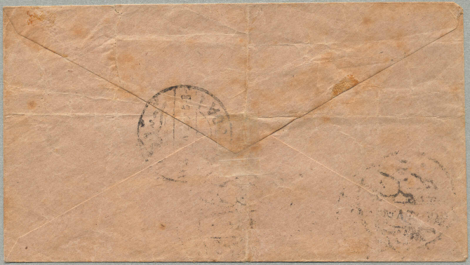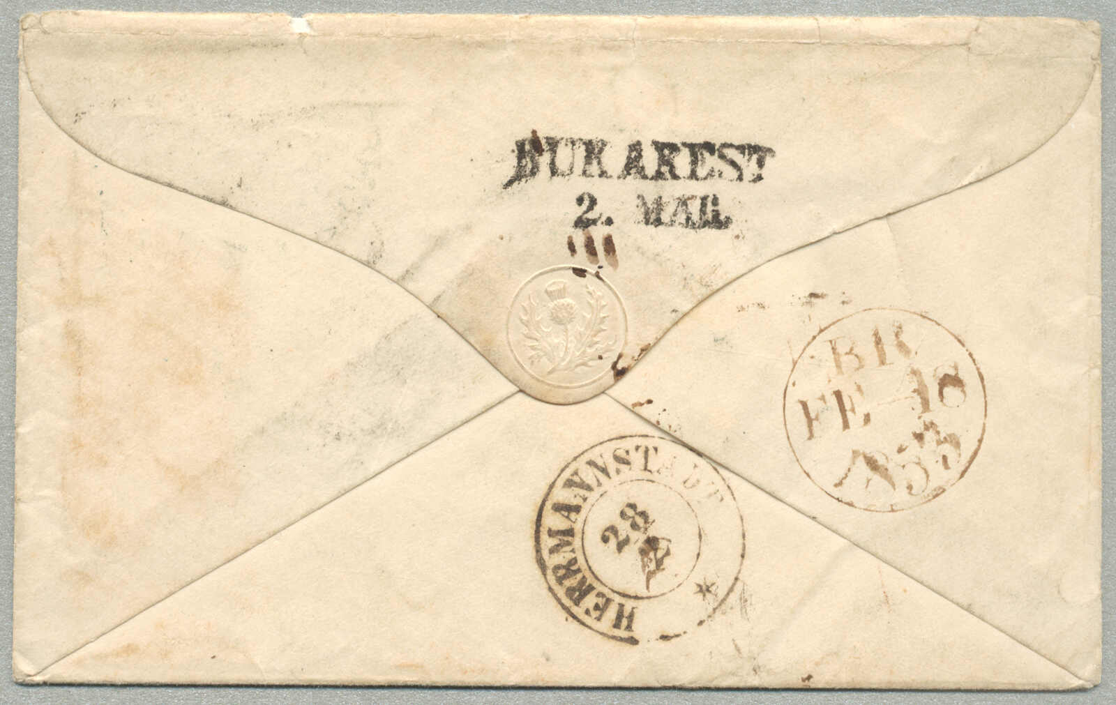 3203 on cover image1853, from Manchester to Bucharest (Wallachia), stampless cover addressed to a noblewoman, bearing blue circular MANCHESTER FE 18 1853 dispatch cds and red CALAIS transit marking on front, with multiple crossed-out manuscript rate notations including 29/9 and 45/6, final rating marked as 29/6 in blue crayon indicating 29 kreuzer due by recipient, reverse with BRITISH FE 18 1853 transit, black circular HERMANNSTADT 28/2 and arrival BUCAREST 2 MAR, routed via France and Austria into the Ottoman-aligned Danubian Principalities, correctly taxed according to the Austrian-Lloyd rate for unpaid first weight class letter from Western Europe to Wallachia, excellent example of complex mid-19th century international mail handling, showing typical rating corrections and full chain of transit to a rare destination, VF! Estimate 700€.