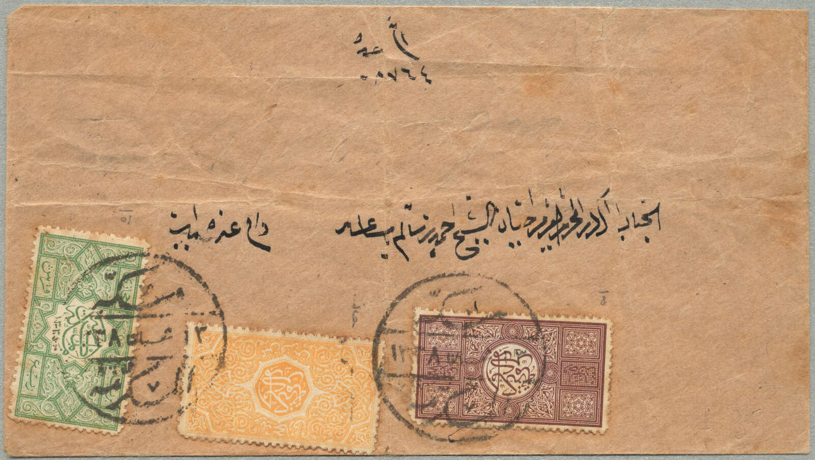 2615 on cover L8,9,1019 image1917, from Mecca to Jeddah, cover franked with three different Hejaz-Nejd issues: 1 para green, 1/8 piastre orange, and 1/4 piastre brown, all with intricate Arabic calligraphy design, cancelled with bilingual double-circle MECCA postmark in Arabic script, clear arrival postmark JEDDA on reverse side, handwritten Arabic address to recipient in Jeddah, no censorship, no tax or instructional markings, internal correspondence during early Saudi rule after the Hejaz and Nejd unification under King Abdulaziz, excellent example of local postal usage with mixed early denominations from transitional postal era, VF! Estimate 400€.