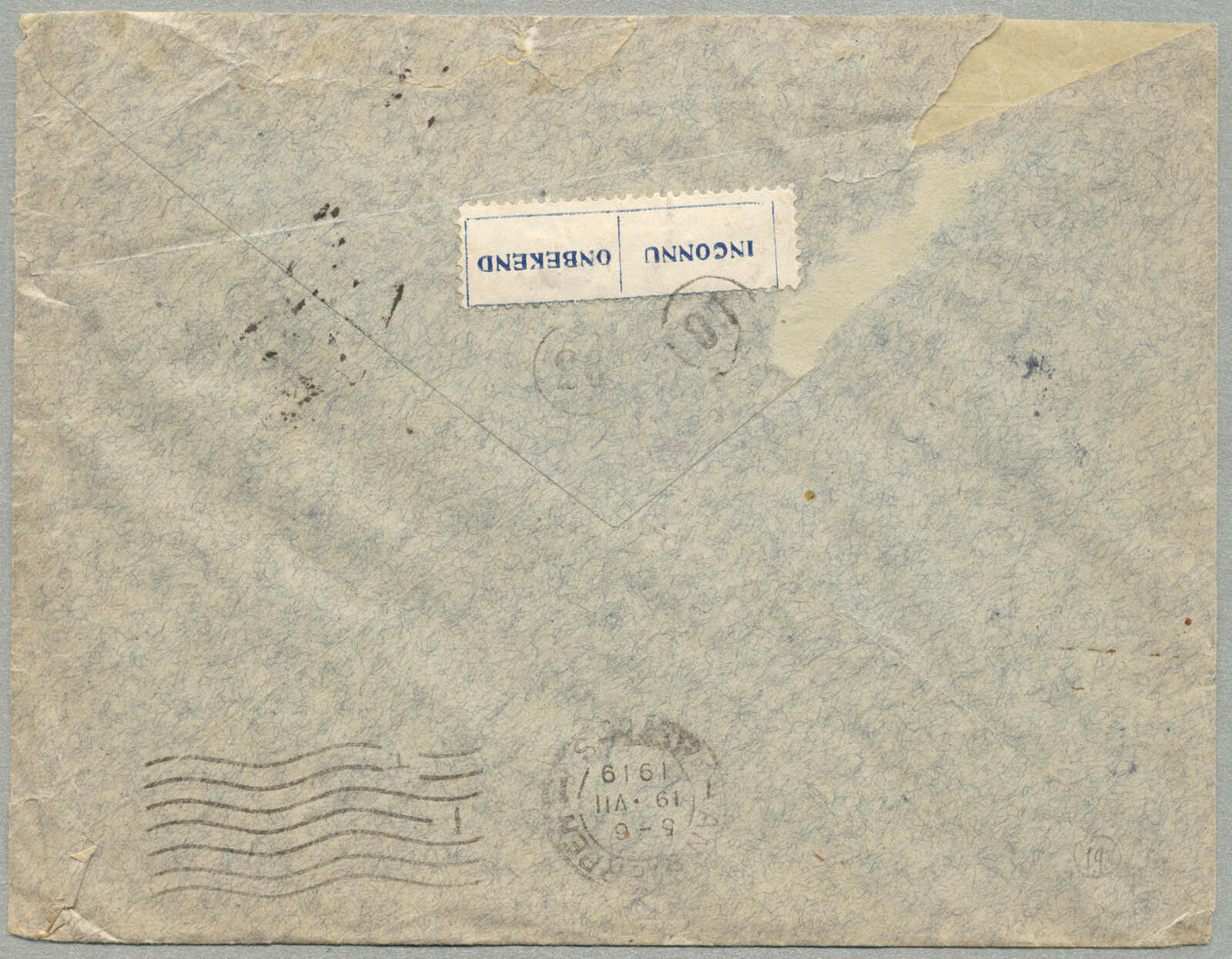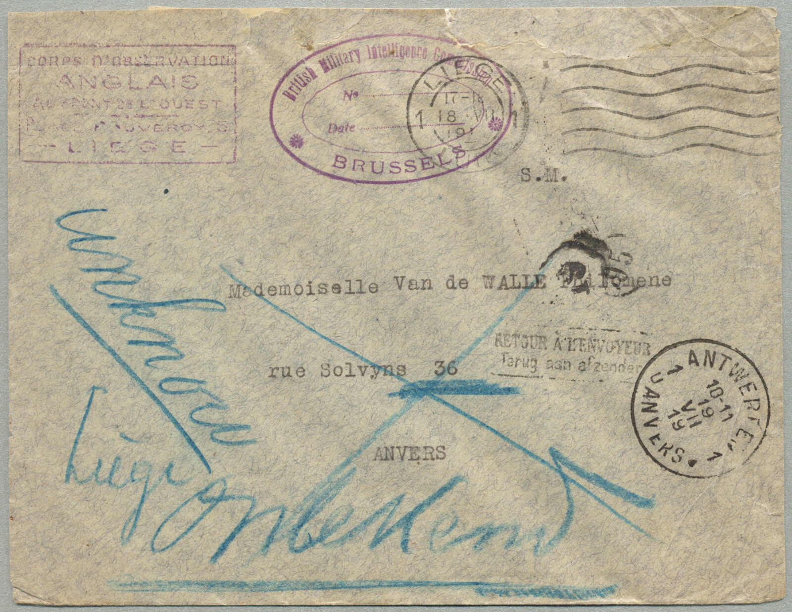 3214 on cover image1919, military mail cover from the BRITISH MILITARY INTELLIGENCE COMMISSION from LIEGE to ANTWERPEN, handstamped on top with oval cancellation of BRITISH MILITARY INTELLIGENCE COMMISSION BRUSSELS and top left with boxed CORPS OBSERVATION ANGLAIS LIEGE, double circular dispatch cancel of LIEGE, ANTWERPEN 19 VII 19 arrival cds, due to the unknown receiver mail was returned to sender indicating in two languages with a handstamp and label on the reverse of the cover, on reverse with ANTWERPEN 5-6 19 VII 1919 arrival cds, historically linked to the immediate post-WWI British military presence in Belgium, the BRITISH MILITARY INTELLIGENCE COMMISSION was part of the Allied occupation forces and played a crucial role in monitoring and stabilizing the region, particularly in contested territories like the Rhineland and surrounding zones, LIEGE was a key strategic point due to its proximity to Germany and recent wartime significance, the CORPS OBSERVATION ANGLAIS was tasked with gathering intelligence and supporting the Belgian authorities during the volatile armistice period, BRUSSELS served as headquarters for British coordination efforts in occupied Belgium, this item reflects the complex logistics and intelligence communications of the Allied postwar administration, the return marking highlights the transitional postal system in a multilingual country undergoing reorganization, the cover’s routing between LIEGE, ANTWERPEN and BRUSSELS illustrates the British military's operational geography and communication pathways in the occupied territories, notable figures associated with the British Military Intelligence operations in Belgium during this period include General Sir William Robertson and Colonel Sir George Macdonogh, both instrumental in structuring postwar military intelligence and diplomatic efforts, ex Kugel, XF! Estimate 900€.