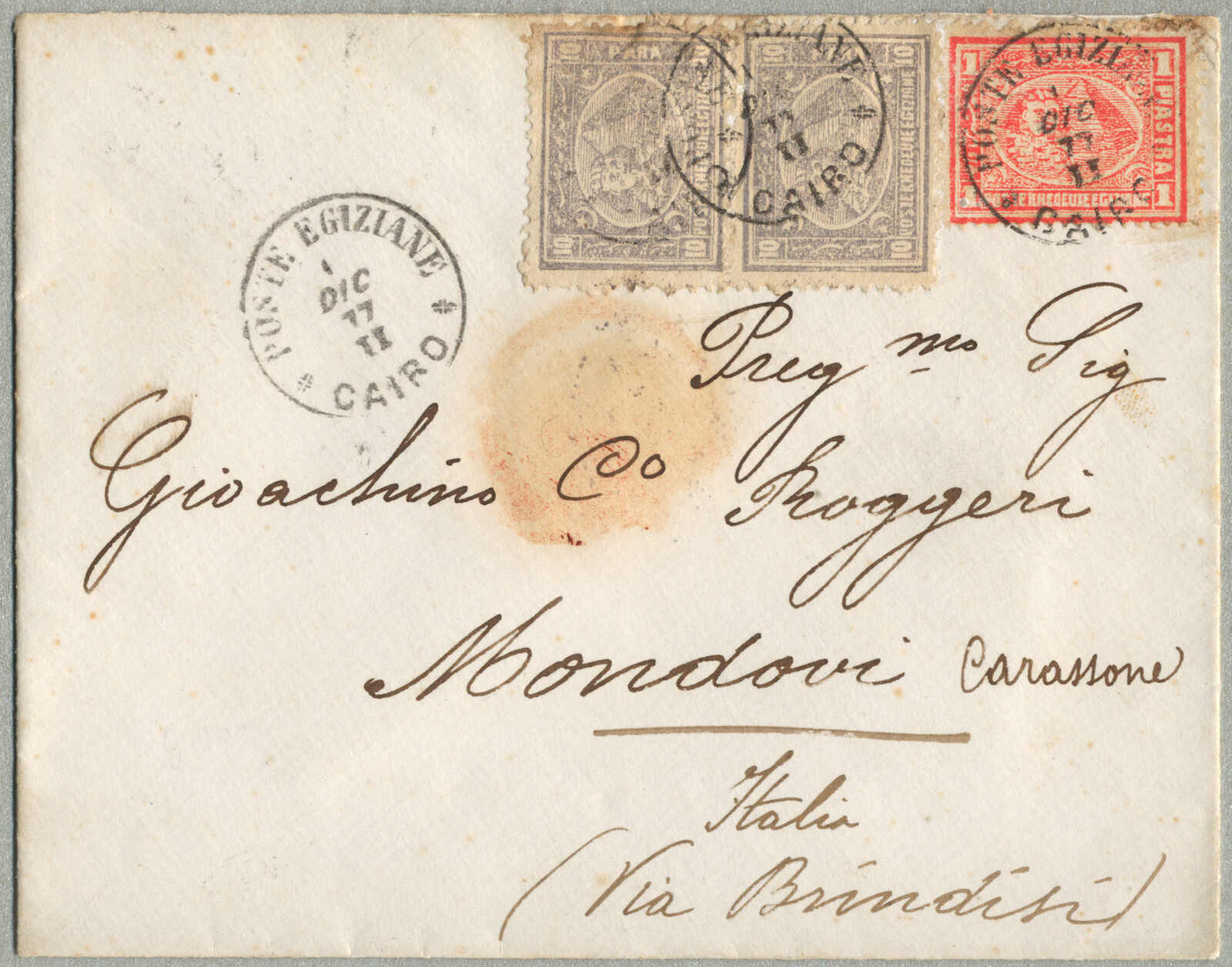 1877,10 und 10 Para und 1 Piaster, auf Kleinbrieflein von Kairo zu MONDOVI/Italien über BRINDISI, gestempelt POSTE EGIZIANE 1 DIC 77 Kairo, rückseitig mit TORINO, BRINDISI und CARASSONE Ankunft, schön Monogramm auf Brief, Wachssiegel verschmieren auf Vorderseite sonst in Ordnung, Pracht! Schätzpreis 200 EUR.