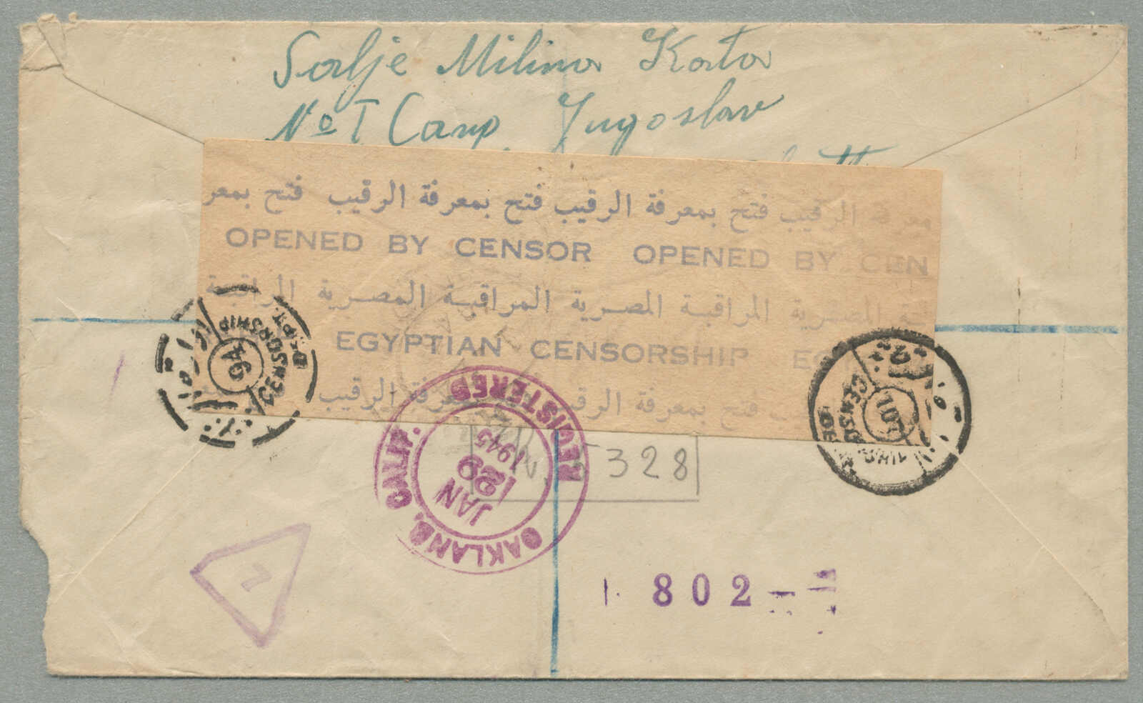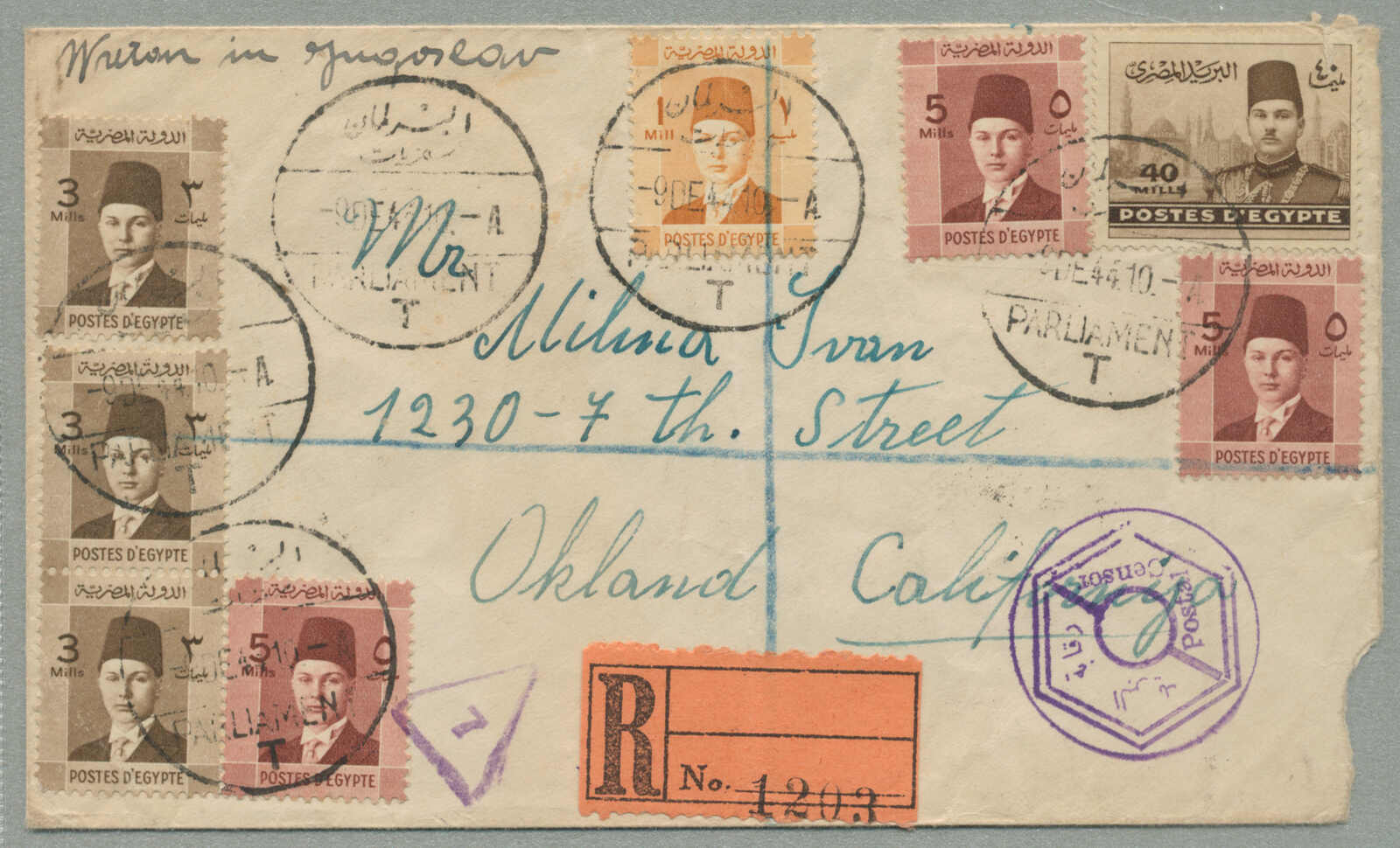 1944, jugoslawische Armeen in Ägypten, ab jugoslawische Lager Nr. 1, Ägypten zu Oakland, Kalifornien, Einschreibebrief freigemacht mit 65 mills in gemischt König Farouk Dauermarken: Paar von 3m, eine Einzelmarke 3m, ein 1 M, drei 5m und einer 40m Briefmarke, alle gestempelt Kairo 9 DEC 44 Parlament mit zweisprachiges Recommandirt-Stempeln, Kasten Einschreibezettel Nr. 1203, große violett Postzensur Sechseckigem arabischen Zensor Vermerk auf Vorderseite, rückseitig mit volles ägyptisch Zensurklebeband Opened By Censor auf Englisch und arabischen, zwei kreisförmig Zensurstempel Nr. 94 und 107, violett OAKLAND CALIF Einschreiben Ankunftstempel datiert JAN 29 1945, gesendet bei jugoslawische Militärpersonal unter Britisch Aufsicht, selten und optisch beachtlich transatlantischen Exil Soldaten Brief aus Ägypten mit Komplettfrankatur und Zensur Handhabung, ex Kugel, Pracht! Schätzpreis 800 EUR.