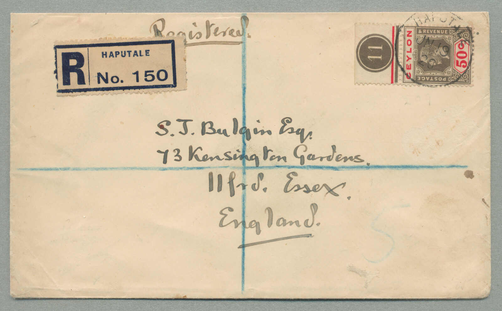 3265 on cover 314 image1926, From Haputale (Ceylon) to Ilford, Essex, England, registered cover franked with 50c black/scarlet King George V showing plate number 11 on margin, cancelled HAPUTALE JN 19 26, registration label HAPUTALE R No. 150, blue crayon registration cross, manuscript Registered at top, addressed to S.J. Bulgin Esq., 73 Kensington Gardens, Ilford, Essex, England, wax seal on reverse and transit backstamp COLOMBO REGISTERED 20 VI. 26, scarce use of plate-numbered high-value definitive on international registered mail, ex Kugel, VF! Estimate 200€.