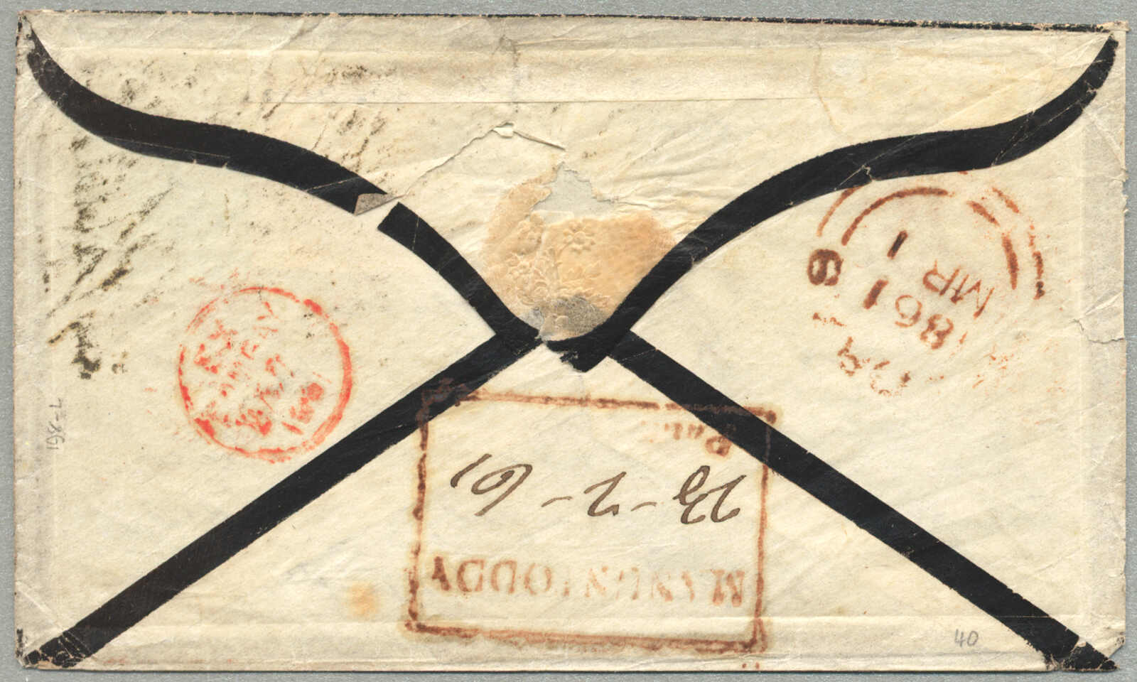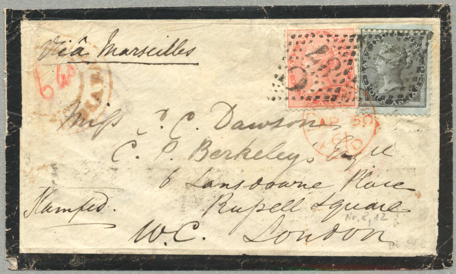 1861, Trauerbrief ab Manuntoddy (Indien) nach London, datiert 1861, oben links mit handschriftlich Leitweg Gebrauchsanweisung über Marseilles, unten links mit handschriftlicher Vermerk gestempelt, freigemacht mit 2 annas matt rosa (SG 41) und 4 annas grauschwarz (SG 46) Ostindische Kompanie Königin Victoriaausgaben, beide übergehend gestempelt mit diamond-of-dots Stempeln, das 4a ist oben beschnitten oberhalb der Zähnung - sehr ungewöhnlich, schauseitigem rot kreisförmig LONDON PAID AP 5 61 Ankunftsstempel, rückseitig mit roter Rechteckstempel MANUNTODDY 23-2-61, rot kreisförmig MADRAS 1861 MR 1, und rot EX BOMBAY 1861, Frankatur totals 6 annas passender das single-rate Briefetarif über Marseilles unter das 1856 englisch-indischer Postabkommen, schwarz umrandet Trauerumschlag, gut erhalten und komplett postalisch Leitweg von einem seltener Ursprung, Pracht! Schätzpreis 800 EUR.