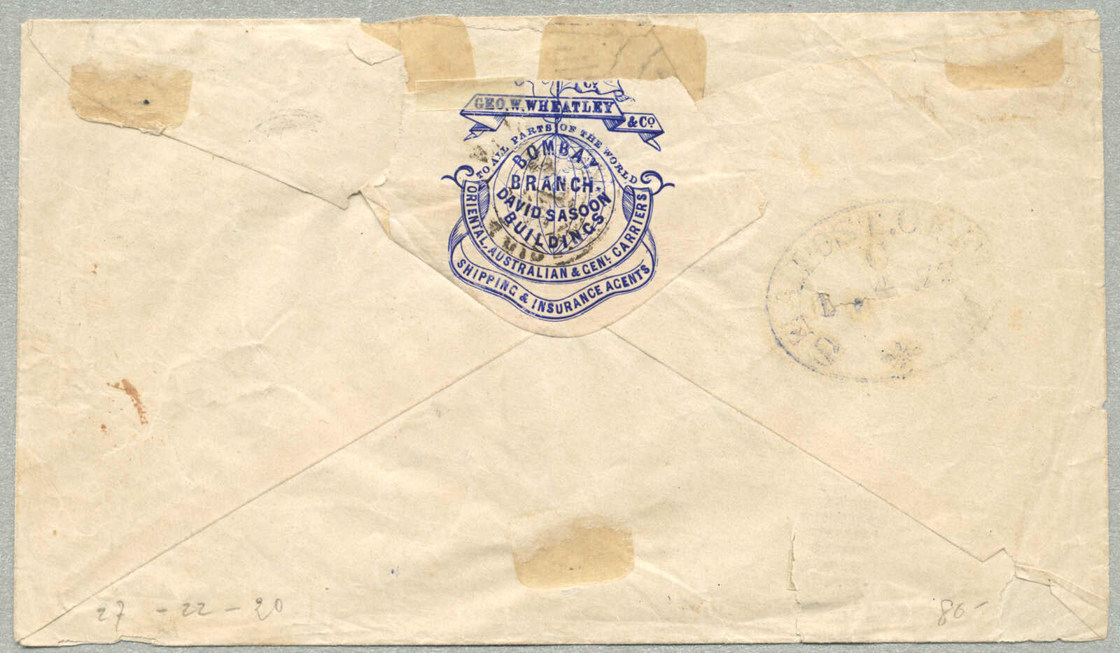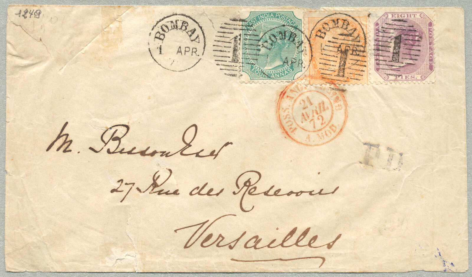 1872, von Bombay nach Versailles (Frankreich), Brief freigemacht mit 8 pies purpur/weiß (SG 52), 2 annas orange (SG 62), und 4 annas grün (SG 64), Königin Victoria ostindische Ausgaben, alle entwertet durch BOMBAY Duplexentwertungen datiert 1 April 72, schauseitigem roter französischer Eingang Datumsstempel POSS. ANG. V. BRIND. Ein MOD. 21 AVRIL 72, schwach blauer Kasten PD unten links hinweisend Vollfranko zu Bestimmungsort, rückseitig mit oval Seepostamt und französischer Ankunftsvermerke, rückseitige Klappe geprägt mit blauem Siegel Bombay Zweig, David Sasoon Bauten - dieses scheint so ein Rechtschreibfehler seit Sassoon war mit zwei s - Gesamtfrankatur von 6½ annas entspricht zu einfaches Gewicht Taxierung über Brindisi nach Frankreich unter das 1870 englisch-französischer Postabkommen, ausgezeichnet handelsüblich Korrespondenz mit vollem postalisch Leitweg und klare Verbindung an die einflussreich Sassoon Handelskompagnie, Pracht! Schätzpreis 800 EUR.