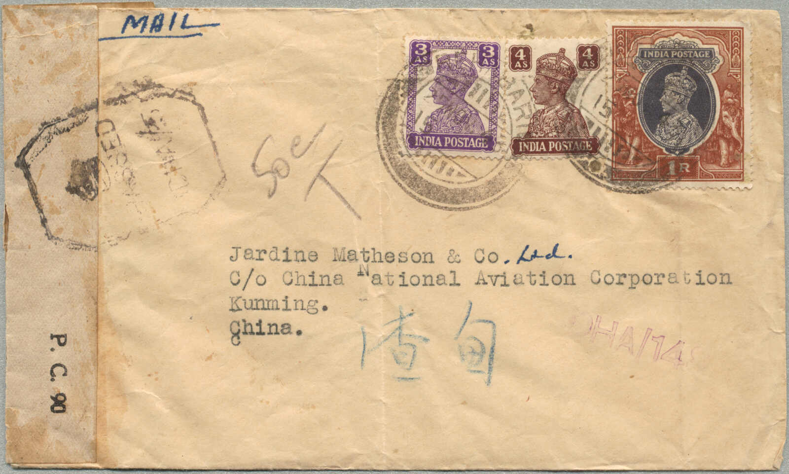 1942, ab REHABARI (Assam, Indien) zu Kunming (China), Kriegszeit zensiert Luftpostumschlag adressiert nach Jardine Matheson und Co. C/o China überregionaler Luftfahrt Aktiengesellschaft, freigemacht mit König Georg VI Dauerserien Ausgaben SG 271 (3 annas violett), SG 273 (4 annas braun), und SG 259 (1 Rupien braunorange und blau), alle entwertet durch REHABARI kreisförmig Datumstempeln, schwarz achteckig Passed By Censor Handstempel oben links, handgeschrieben 50c T in Bleistift hinweisend provisorisch Nachtaxierung Abschätzung, Blaustift Briefpost Vermerk, rückseitig mit chinesischer ROC-style Ankunftsstempel KUNMING 4. 12. 31 (4 Dezember 1942), selten WWII Indochinesische Luftpost wahrscheinlich befördert über das jemanden trübsinnig machen Strecke, mit Komplex Zensur und eventuell Transit Abschätzung, Pracht! Schätzpreis 600 EUR.