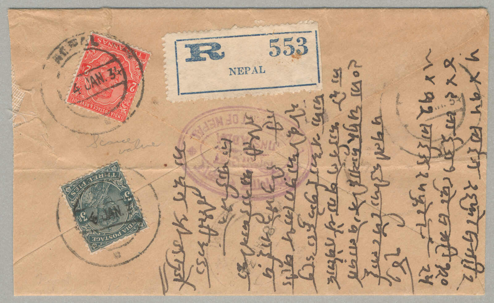 1934, ab NEPAL zu SAWARI Lager über Post Office MAILANI zu KHESRI, Frankatur beinhaltet 2 annas rot König Georg V und 3 pies schwarz König Georg V, beide übergehend gestempelt mit NEPAL 4 JAN 34, blau Einschreibezettel NEPAL 553, handschriftlich Zulassungsnummer, zusätzlich purpur oval NEPAL Post Office Handstempel, umfangreiche handgeschrieben Botschaft auf der Rückseite, selten internen Einschreiben Verwendung innerhalb Nepal während Britisch Indien Periode, geleitet durch MAILANI, ein Post Office bestehend unter Britisch Indian Verwaltungs bespringen vorgezogenem Regionen beim nepalesischen Grenze, das Kombination von Britisch indische Marken gebraucht innerhalb Nepal bebildert ein seltenes Stück der exterritorialen postalisch Kooperation während eine Periode von entfaltend administrativer Selbstverwaltung, Verwendung wahrscheinlich in direktem Zusammenhang mit das Militär oder übersicht Operationen im Himalayan frontier, möglicherweise zugehörige mit den Briten Indian Armys Anwesenheit in nördlich Indien und seines logistisch Kommunikation mit alliert Gurkha Vorposten, ex Kugel, feinst bis Pracht! Schätzpreis 400 EUR.