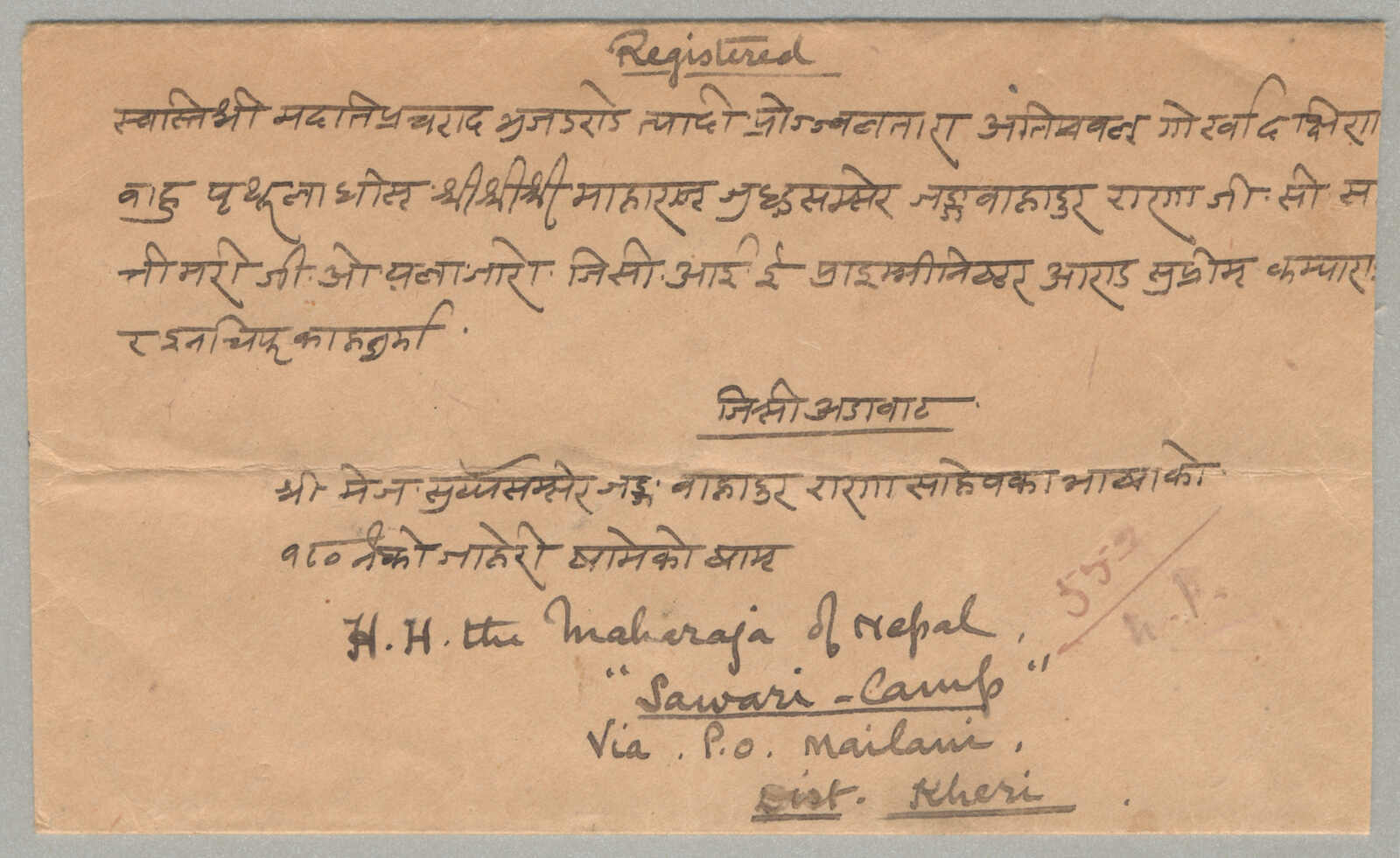 3305 on cover image1934, from NEPAL to SAWARI Camp via P.O. MAILANI to KHESRI, franking includes 2 annas red King George V and 3 pies black King George V, both tied by NEPAL 4 JAN 34, blue registration label NEPAL 553, manuscript registration number, additional purple oval NEPAL POST OFFICE handstamp, extensive handwritten message on reverse, scarce internal registered usage within Nepal during British India period, routed through MAILANI, a post office established under British Indian administration to service remote regions near the Nepalese border, the combination of British Indian stamps used within Nepal illustrates a rare example of extraterritorial postal cooperation during a period of evolving administrative autonomy, usage likely linked to the military or survey operations in the Himalayan frontier, possibly associated with the British Indian Army’s presence in northern India and its logistical communication with allied Gurkha outposts, ex Kugel, F-VF! Estimate 400€.