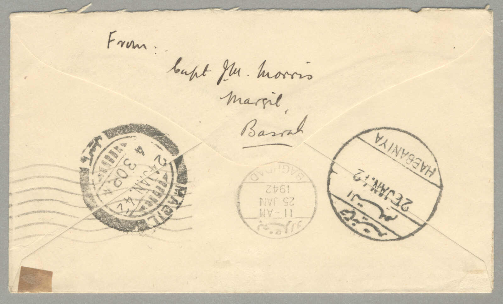 1942, von Basra zu HABBANIYA, gemäß Absenders Aufschrift, Briefumschlag adressiert nach Chef Chemikers Offizier Luft Generalkommando HABBANIYA, violetter Kasten Militärzensur Stempel in arabisch auf Vorderseite Lesen al-raqaba al-askariya (Militärzensur), rückseitig gestempelt MABIL 24 Jan 42, BAGHDAD 25 Jan 1942, HABBANIYA 26 Jan 42, alle Vermerken in arabisch und englische, Britisch Militär Luftbase Verwendung während WWII, ungewöhnlich internen Leitweg in Irak Feldpost, BASRA ein kriegswichtig Hafen Stadt an der Spitze von das Shatt al-Arab waterway beim Persischer Golf diente als ein Lebenswichtige logistics hub für Britisch und Indian Gewalten während der Anglo-Iraqi War und anschliessende alliierte Besatzung, das Korrespondenz gerichtet an HABBANIYA RAF STATION orteten westlich von Baghdad an wesentlich königlich Luftwaffe Feste angesiedelt in 1937 und später ein Schwerpunkt während der 1941 pro-Axis Schlag Anhieb in Irak unter Führung von Rashid Ali al-Gaylani, RAF HABBANIYA gespielt ein Schlüssel role in erwehrend das Aufstand und wieder behauptend Britisch Kontrolle, das genannt Empfänger Chef Chemikers Offizier Luft Generalkommando wahrscheinlich in Verbindung mit das Unterhaltsgeld von Flugbetriebsstoff Maßstäben und chemisch Kriegswesens preparedness an der Unterseite, MABIL ein lesser-known zwischenliegend Briefpost Halt möglicherweise in direktem Zusammenhang mit Stammes- oder Militär V-Mann gibt auf längs das Euphrates, BAGHDAD damals unter Britisch administrativer Kontrolle sah verstärkte Militär Straßenverkehr und postalisch Wahlprüfung, das Verwendung von zweisprachiges Zensurstempel und volles Transit Bekräftigung adds beide Rarität und Forschung Wert, internen Feldpostbrief von dieser caliber innerhalb Irak 1942 ist selten, ex Kugel, Kabinett! Schätzpreis 1. 200 EUR.