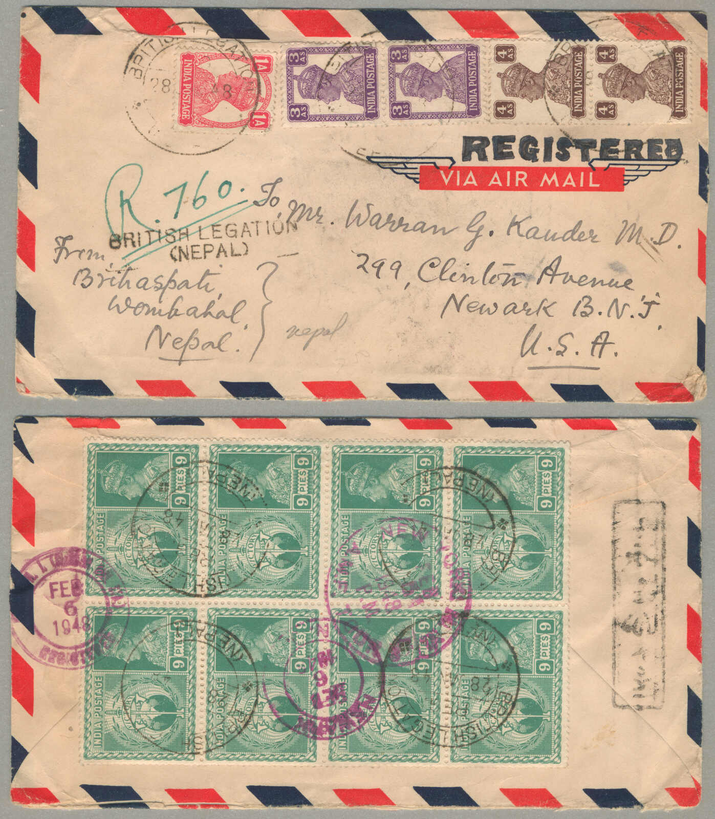 1945, ab Britisch Gesandtschaft in Kathmandu, Nepal nach Newark, New Jersey, eingeschriebener Luftpostbrief freigemacht mit Indien Porto, 1 Anna rot, zwei 3 Anna violett, zwei 4 Anna braun auf Vorderseite, und Achterblock 9 Pies grün auf der Rückseite, gestempelt Britisch Gesandtschaft (NEPAL) Rundstempel und violett Abschläge datiert FEB 6 1945, handgestempelt Einschreiben und über Flugpost mit handschriftlich Registratur Vermerk R. 760, geleitet über Indian Postwesen aufgrund Nepal nicht als Angehörige des Weltpostverein, selten und gut freigemacht Kriegszeit diplomatischer Brief mit Poststrecke durch Britisch Indian system, herausragendes Stück von frühen Luftpost ab Nepal in die USA über Britisch Gesandtschaft Handhabung, ex Kugel, Kabinett! Schätzpreis 900 EUR.