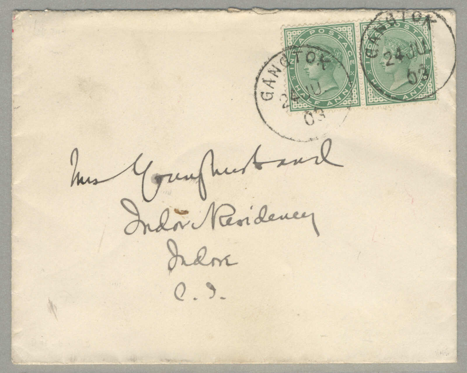 3310 on cover 114 image1903, from Gangtok to Indore, franked with pair of Queen Victoria 1/2 anna green, cancelled GANGTOK 24 JUL 03, backstamped INDORE 1903, addressed to Mrs. Younghusband at the India Residency, personal letter sent by Col. F. E. Younghusband during the early stages of the 1903 British expedition to Tibet, posted from the temporary post office at Gangtok shortly before the British column crossed the Kongra La Pass into Tibetan territory, significant historical item from the leader of the Tibet Frontier Commission during the buildup to the Younghusband Mission, ex Kugel, VF! Estimate 900€.