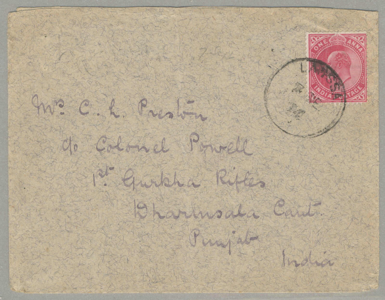 1904, ab Lhassa zu Dharamsala, freigemacht mit 1 anna karmin, gestempelt LHASSA 7 SEP 04, rückseitig gestempelt Base Office 18 SE 04 und ein zweiter unscharf Abschlag, adressiert nach Mrs. C. E. Preston Betreuung von Oberst Powell, erste Gurkha Gewehre, persönlich Korrespondenz ab Capt. E. E. Preston des Beständen Ablösung des Younghusband Forschungsreise, aufgegeben auf der Tag das Anglo-Tibetan Vertrag war signiert, seltenes Stück von ausgehend Feldpost ab Tibet bei Börsenschluss von der britischen Besetzung von Lhassa, aussagekräftige geschichtlich Verband mit dem Abschluss des 1903-04 Britisch Forschungsreise, ex Kugel, Pracht! Schätzpreis 1. 000 EUR.