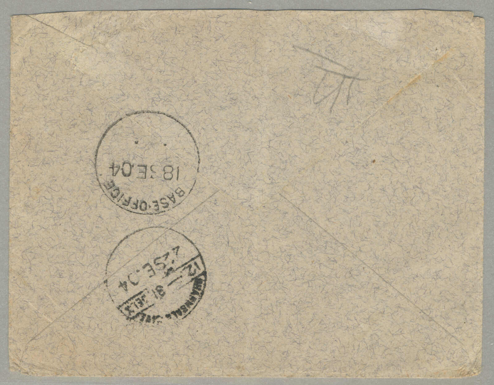 3303 on cover image1920, From BANGAR ABAS town to Bombay, franked with 2 annas 6 pies ultramarine King George V stamp, indistinct origin cancel dated 29 JUL 20, arrival BOMBAY cancel, Arabic manuscript note at left in sender's hand, slightly worn edges and vertical fold not affecting stamp, early commercial usage from BANGAR ABAS, identified as a variant spelling of BANDAR ABBAS, strategically located port city on the Persian Gulf within the territory of Persia (Iran), during the era of British political and commercial presence along the southern Persian coastline, posted through the British postal agency operating in Bandar Abbas under imperial arrangements, where Indian stamps and postal rates were in use for British-run overseas mail, marking this as part of the wider network of British India Post Offices in the Persian Gulf, distinct from military occupations such as the 1915 Bushire Overprints, the 2 annas 6 pies ultramarine King George V definitive stamp, issued under British India in 1911, reflects imperial authority, and its usage here testifies to the functioning of Indian postal services abroad under British control, the faint strike dated 29 JUL 20 coincides with a transitional postwar period when British influence in Persia remained strong despite regional shifts in sovereignty and internal Persian resistance to foreign control, the legible BOMBAY receiving cancel confirms the effective handling of foreign-origin mail via the imperial postal network, Arabic notation in the sender’s hand adds ethnographic dimension, indicating a local Persian-origin sender, a detail of interest to scholars of Gulf postal history and imperial communication systems, this type of cover, emerging from British-run postal agencies in non-colonial but politically influenced regions such as Persia, is increasingly sought after for its documentation of British-Indo-Persian mail routes and their integration into global imperial structures, linked to King George V, monarch and emperor during the apex of British overseas administration, whose image on postage symbolised dominion across the subcontinent and its extraterritorial spheres of operation, ex Kugel, uncommon example of Indo-British postal agency use in Persian territory, XF! Estimate 1.200€.