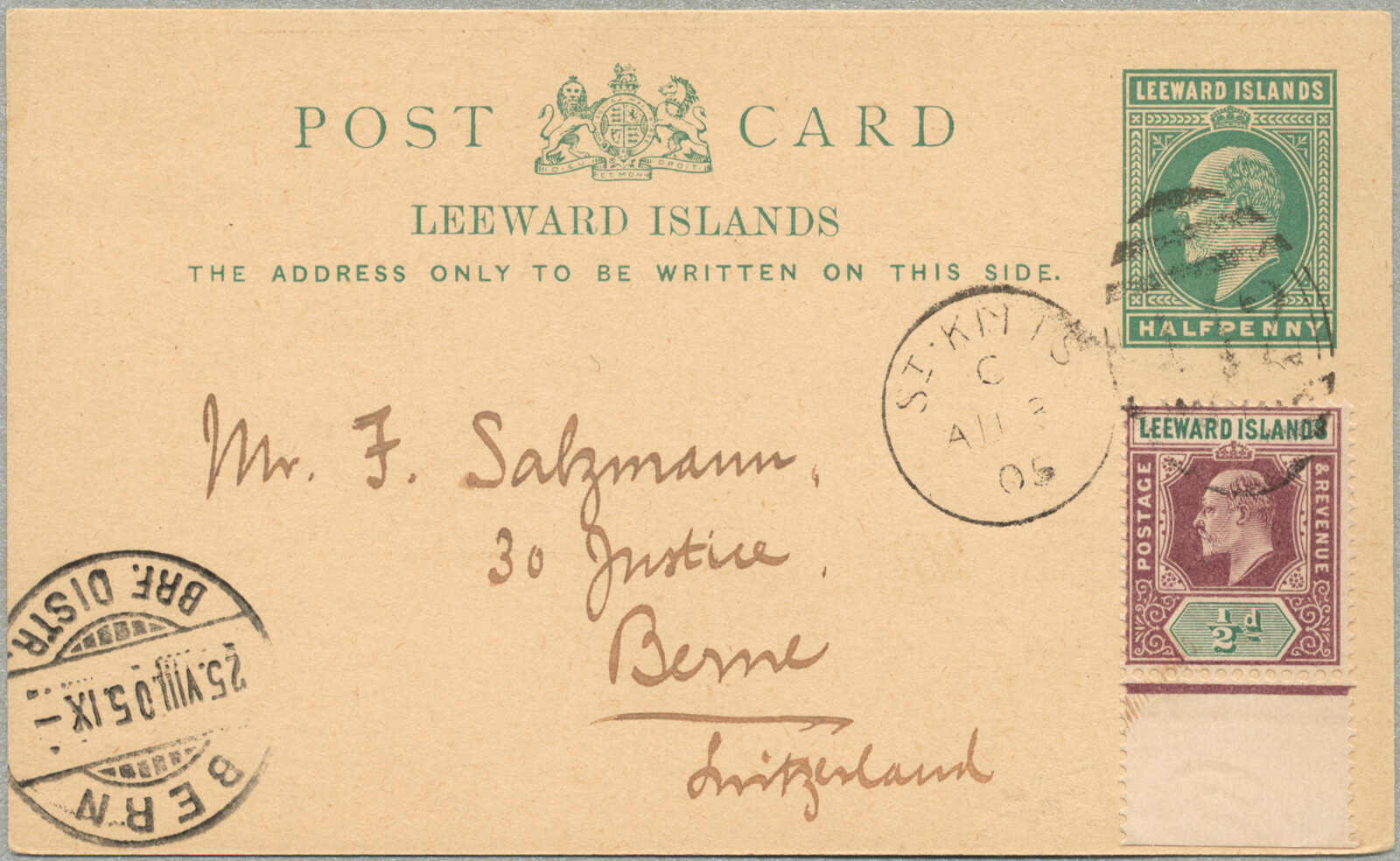 3335 on cover image1905, 1/2d on 1/2d postal stationary from ST. KITTS to BERN/Switzerland, 1/2d with margin, arrival BERN, fresh and desirable, XF! Estimate 200€.