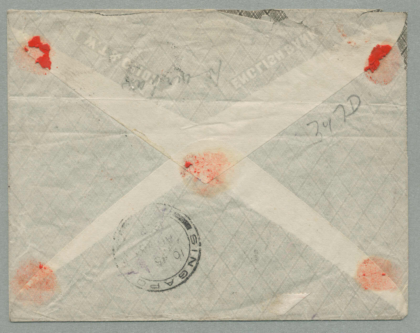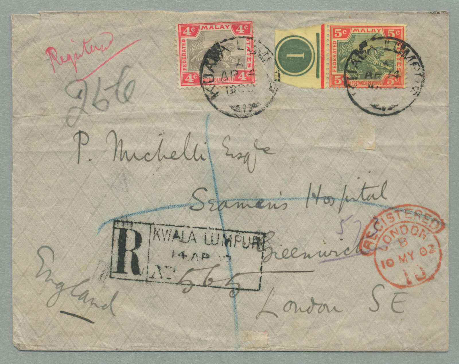 3338 on cover 17.18 image1902, From Kuala Lumpur (Federated Malay States) to London, England, registered cover franked with 4c black and carmine and 5c green and carmine on yellow with green plate number 1 on margin, all cancelled KUALA LUMPUR / A / AP 14 / 1902, boxed registration handstamp R KWALA LUMPUR / 14.AP 02 with manuscript number 565, addressed to Seamens Hospital, Greenwich, London SE, red London REGISTERED / LONDON / B / 10 MY 02 arrival strike on front, backstamped SINGAPORE / 10 45 / AP 30 / 1902, on printed grey envelope, ex Kugel, VF! Estimate 600€.