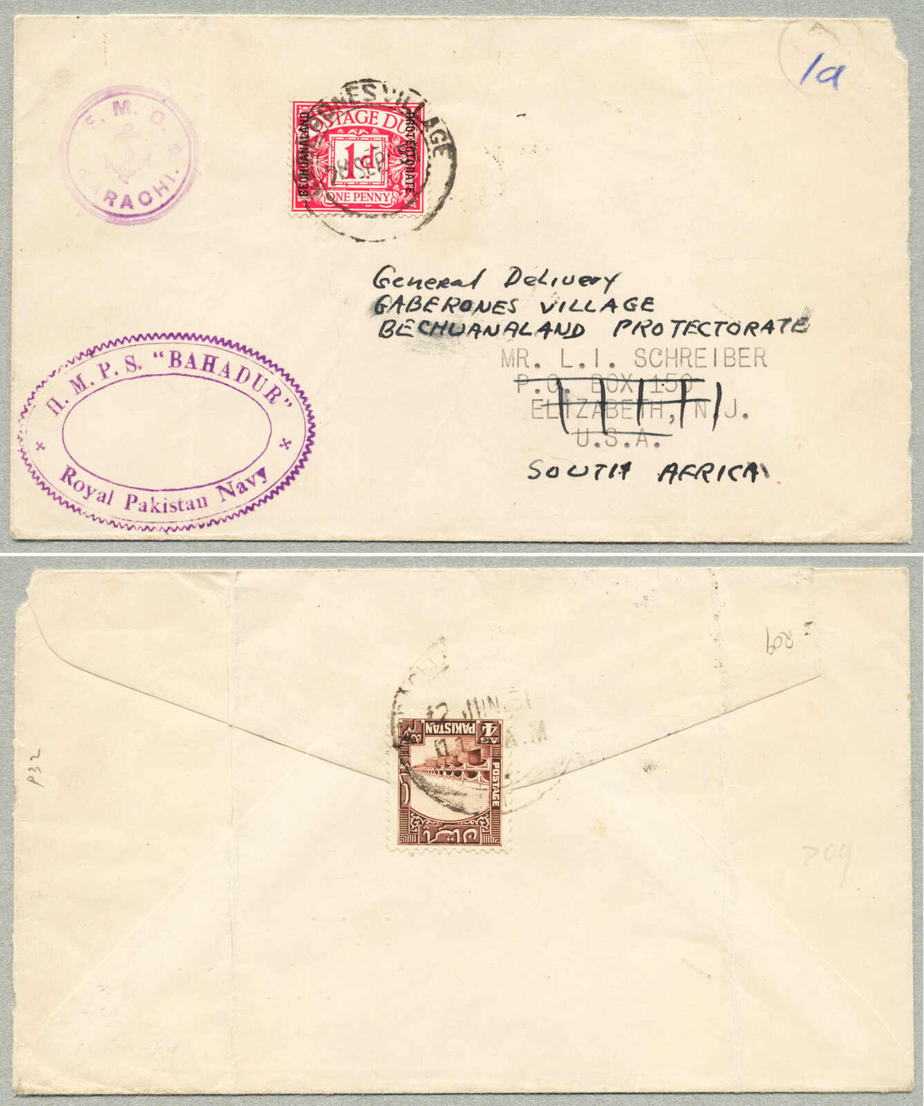 1951,4as, ab Pakistan (auf der Rückseite) und 1d Nachgebühr mit Aufdruck ab Bechuanaland, auf Marine Brief von Karachi zu Elisabeth/NJ/USA weitergeleitet nach Gaberones Ortschaft/Bechuanaland Protektorat da taxiert mit 1d karmin mit schwarz BECHUANALAND PROTECORATE Überdruck, violett FMO Anker KARACHI und oval HMPS BAHADUR königlich Pakistan Marine Stempeln auf Vorderseite, eine ungewöhnliche Brief, frisch und gesucht, ex Besancon, Kabinett! Schätzpreis 600 EUR.