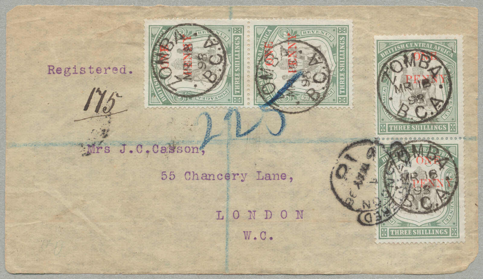 3353 piece 53 image1898, 1d on 4s, (4), red ONE PENNY opt, on registered letter front from ZOMBA to LONDON, all cancelled with ZOMBA B.C.A, one with arrival REGISTERED LONDON, both pairs with top stamp with variety closed E in ONE, very fresh and desirable, VF-XF! Estimate 400€.