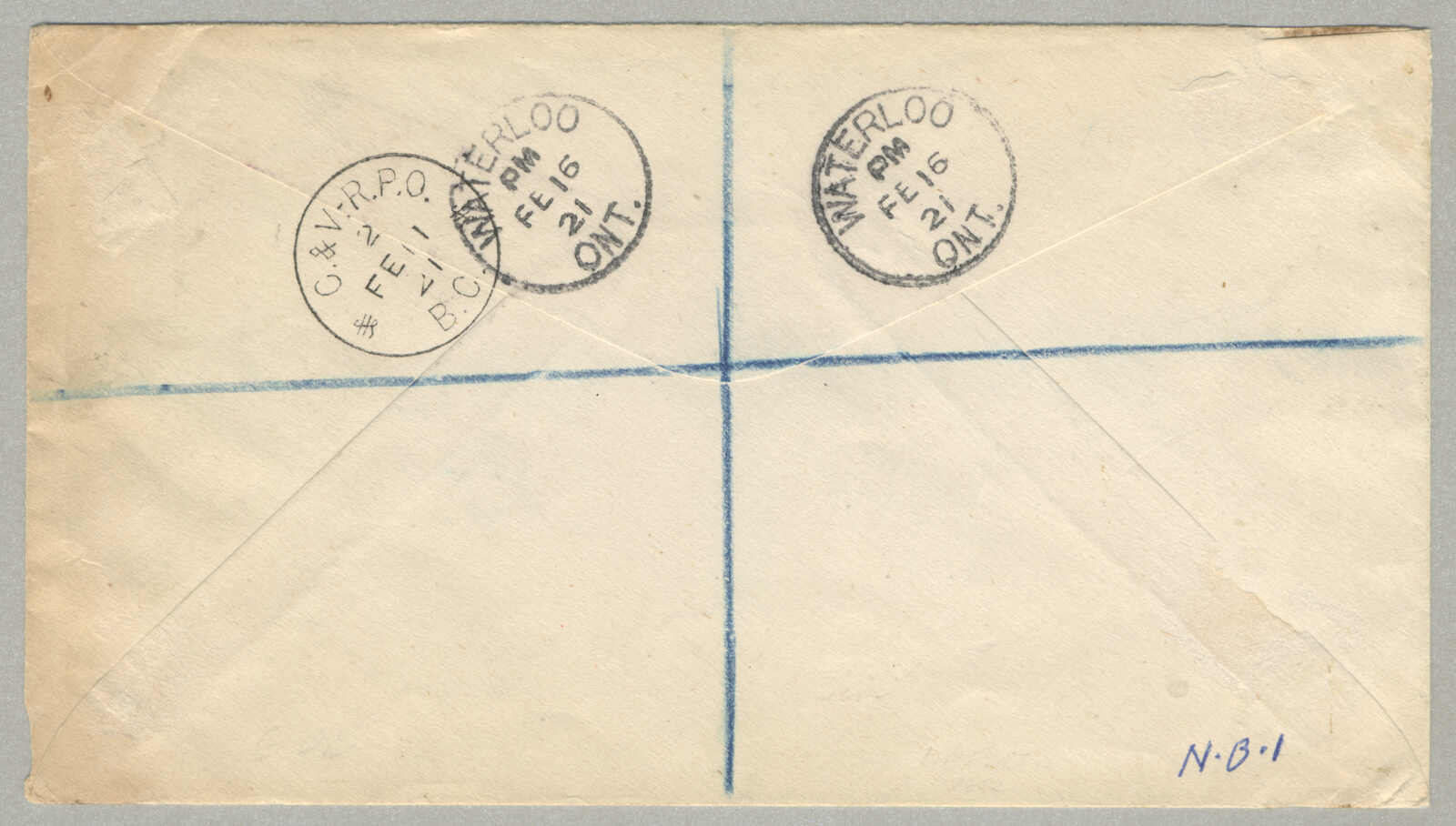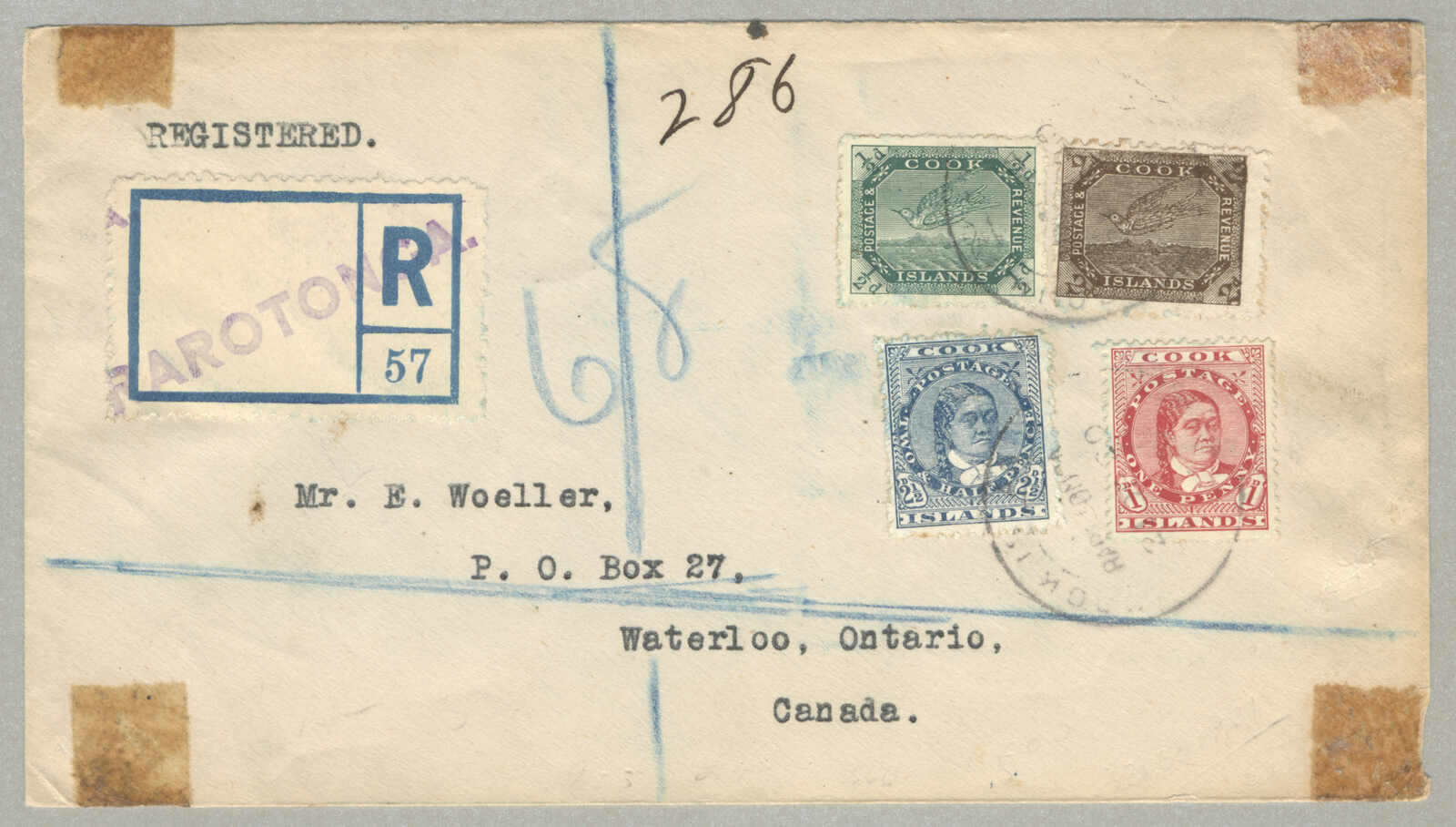 1921,1/2d + 1d + 2d + 2 1/2d, (4), Koch Insel Briefmarken auf Einschreibebrief aus Rarotonga zu Waterloo, Ontario, Kanada, rückseitig mit C&V-RPO und Waterloo Ankunft Entwertungen, ein paar Falzreste zu Ecken sonst in Ordnung, ungewöhnlich Absenders und Bestimmungsort, selten, Pracht! Schätzpreis 600 EUR.