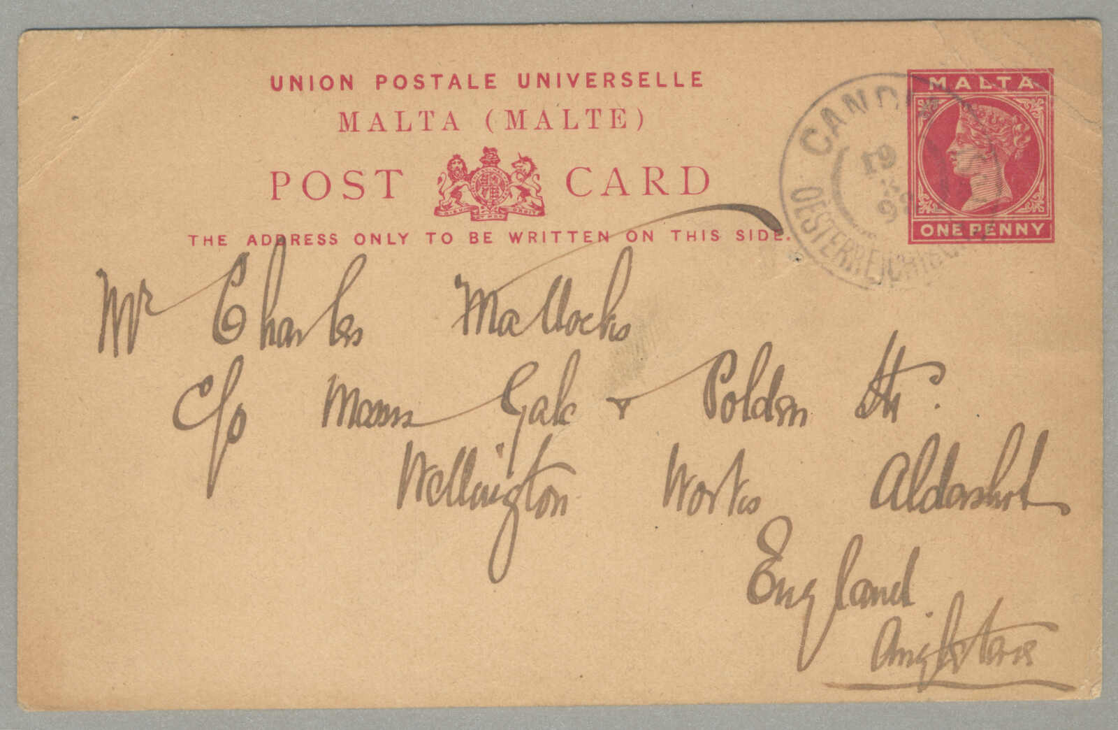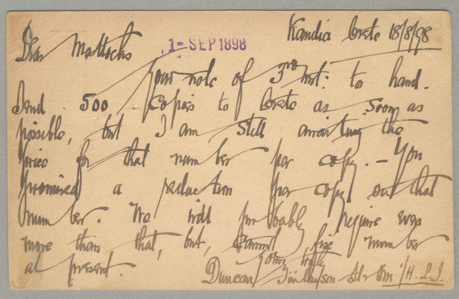 3340 on cover stationary postcard image1898, from Candia Crete to Aldershot England, 1 penny red postal stationery card of Malta cancelled CANDIA 19 8 98, posted by Quartermaster Finlayson of the 1st Highland Light Infantry via Austrian post office in Candia, message on reverse dated 18 8 98 from Candia Crete requesting quotation for printing 500 copies of a map of Crete, early example of British military mail during the multinational intervention following the 1897 Cretan uprising against Ottoman rule, use of foreign stationery reflects temporary reliance on available postal channels prior to establishment of local Cretan or British facilities, historically important as documentation of logistical planning by British forces during the initial occupation phase, ex Kugel, VF! Estimate 600€.