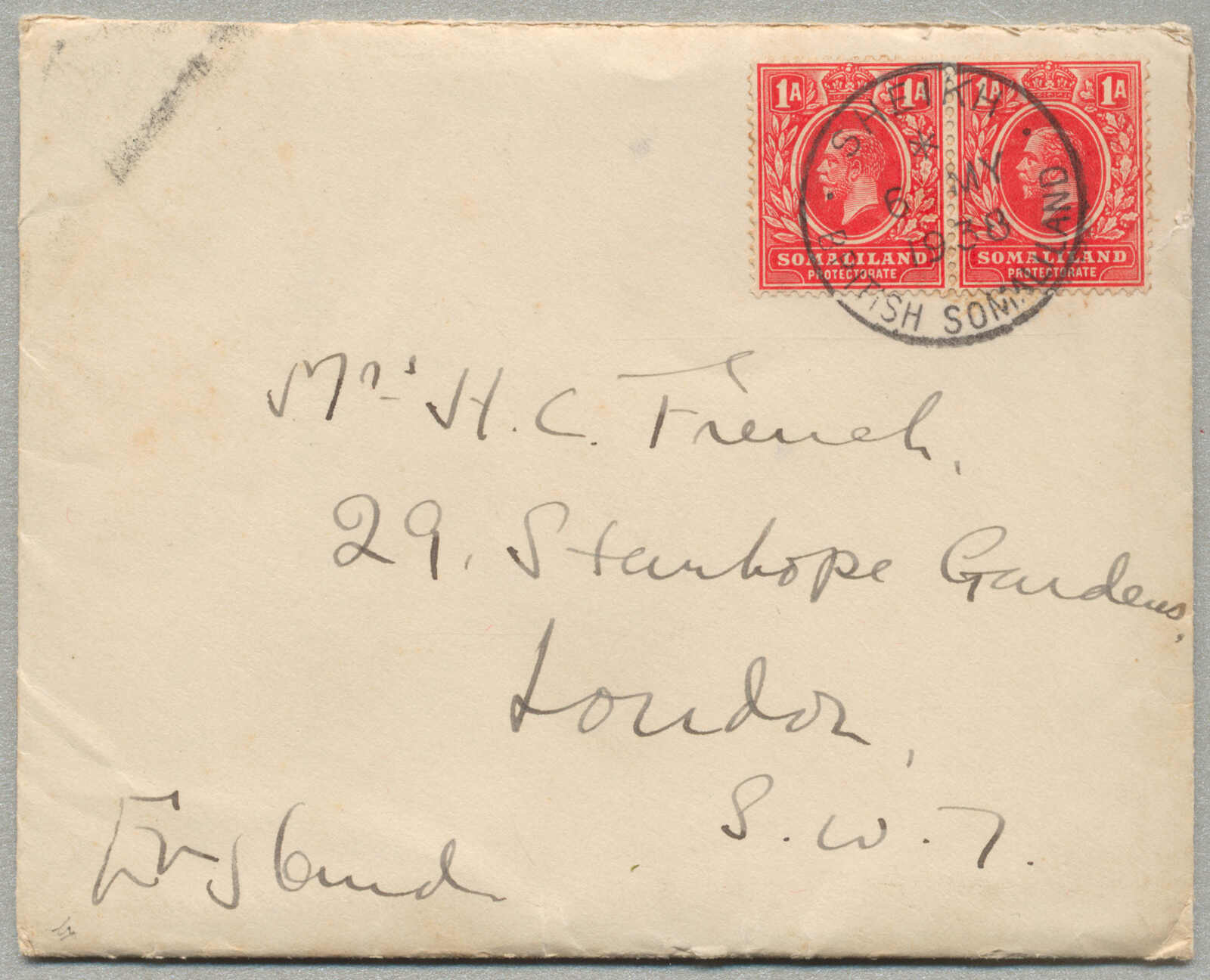 1938,1a + 1a, rot, auf Brief von SHEIKH nach London, gestempelt SHEIKH Britisch SOMALILAND, Ganzbrief von Hauptmann H. Französischer an seine Mutter geschrieben zu GEDAIS erwähnenswert an Einladung an die Governers Haus, Beschreibung einbegriffen, sehr frisch und gesucht, ex Besancon, Kabinett! Schätzpreis 400 EUR.
