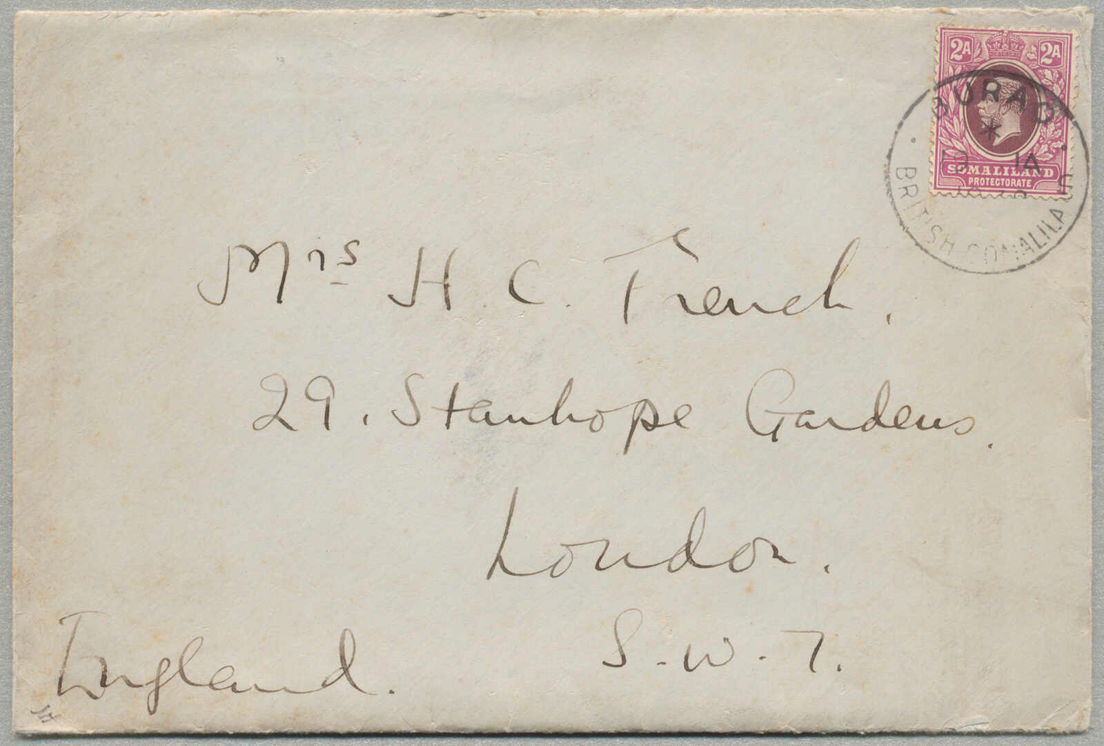 1938,2a, matt und lebhaftpurpur, auf Brief von BURAO nach London, gestempelt BURAO Britisch SOMALILAND, Ganzbrief von Hauptmann H. Französischer an seine Mutter, Beschreibung einbegriffen, sehr frisch und gesucht, ex Besancon, Kabinett! Schätzpreis 400 EUR.