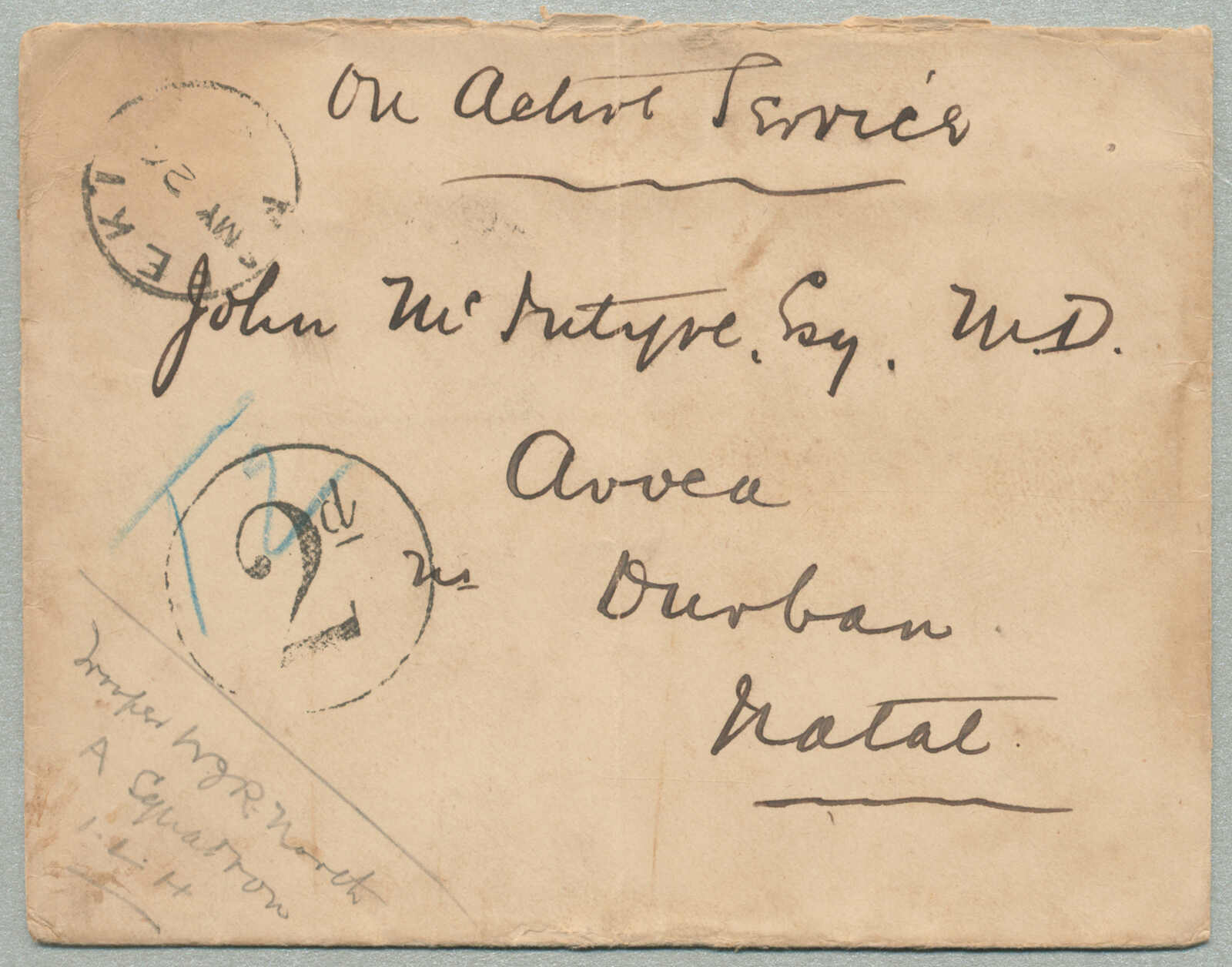 3366 on cover image1900, fieldpost from Trooper MJR North, A Squadron 1st Light Horse regiment from MAFEKING to DURBAN/Natal, circled 2d and blue T2 on front as well as MAFEKING dispatch cancel, reverse with KIMBERLEY CGH arrival, the letter recipient was taxed with 2d, Estimate 400€.