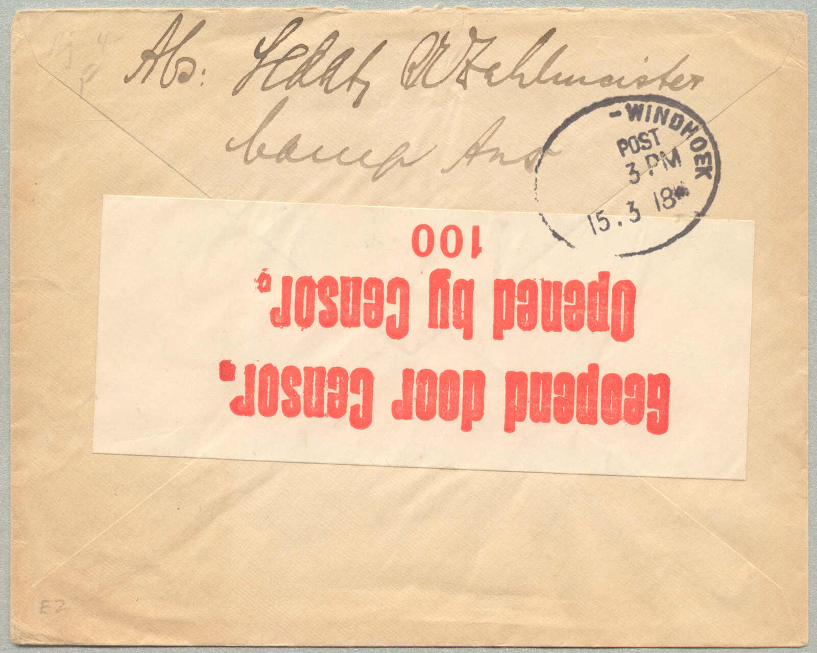 1917, Britische Besetzung von DEUTSCH-SÜDWESTAFRIKA, Kriegsgefangengenbrief ab Swakopmunder zu WINDHUK/28. 3. 17 zu erstere Personal Amtsverwalter des SCHUTZTRUPPE in WINDHUK, mit Stempel des Commandant von Kriegsgefangenenlager Dienst frei/26/Protektorat S. W. Afrika, Ankunft WINDHUK, Passed censor, rückseitig mit Aufklebezettel Opened By Censor, ex Kugel, beförderte während das britische Militärverwaltung nachstehend das südafrikanische Feldzug in DEUTSCH-SÜDWESTAFRIKA (1915-1919), Teil der großartiger kriegswichtig Mühe neutralisieren Deutsche colonial Vorposten während erster Weltkrieg, diese spezielle Artikel adressiert nach an Dienst des SCHUTZTRUPPE, das colonial Militär Gewalt litt bis 1915 bei Major Viktor Franke, bekannt für seiner Widerstand während der Belagerung von Otavi und Auslieferung zu Khorab, evidences das beaufsichtigt Kommunikation zwischen Internierten Deutsche Militärpersonal und Kolonialbeamten unter Britisch Aufsicht, Stempel Dienst frei/26/Protektorat S. W. Afrika selten und anzeigend von zensiert, non-franked Kriegsgefangenenschaft Korrespondenz erlaubte bei Britisch Militärkommando, Zensur-Banderole auf der Rückseite bekräftigt das planmäßig Briefpost überwachend innerhalb das Besatzungsgebiet, von Bedeutung für seines Kopplung an die zusammenklappen des Deutsche Kolonialregime in Afrika und seines Übernahme in die Völkerbund Mandat system post 1919, ein wichtiges vom Menschen geschaffenes Objekt innerhalb die Postgeschichte von Deutsche Kolonien und 1. Weltkrieg geopolitics, sehr selten, begehrenswert und geschichtlich verweisend, ex Kugel, Kabinett! Schätzpreis 2. 000 EUR.