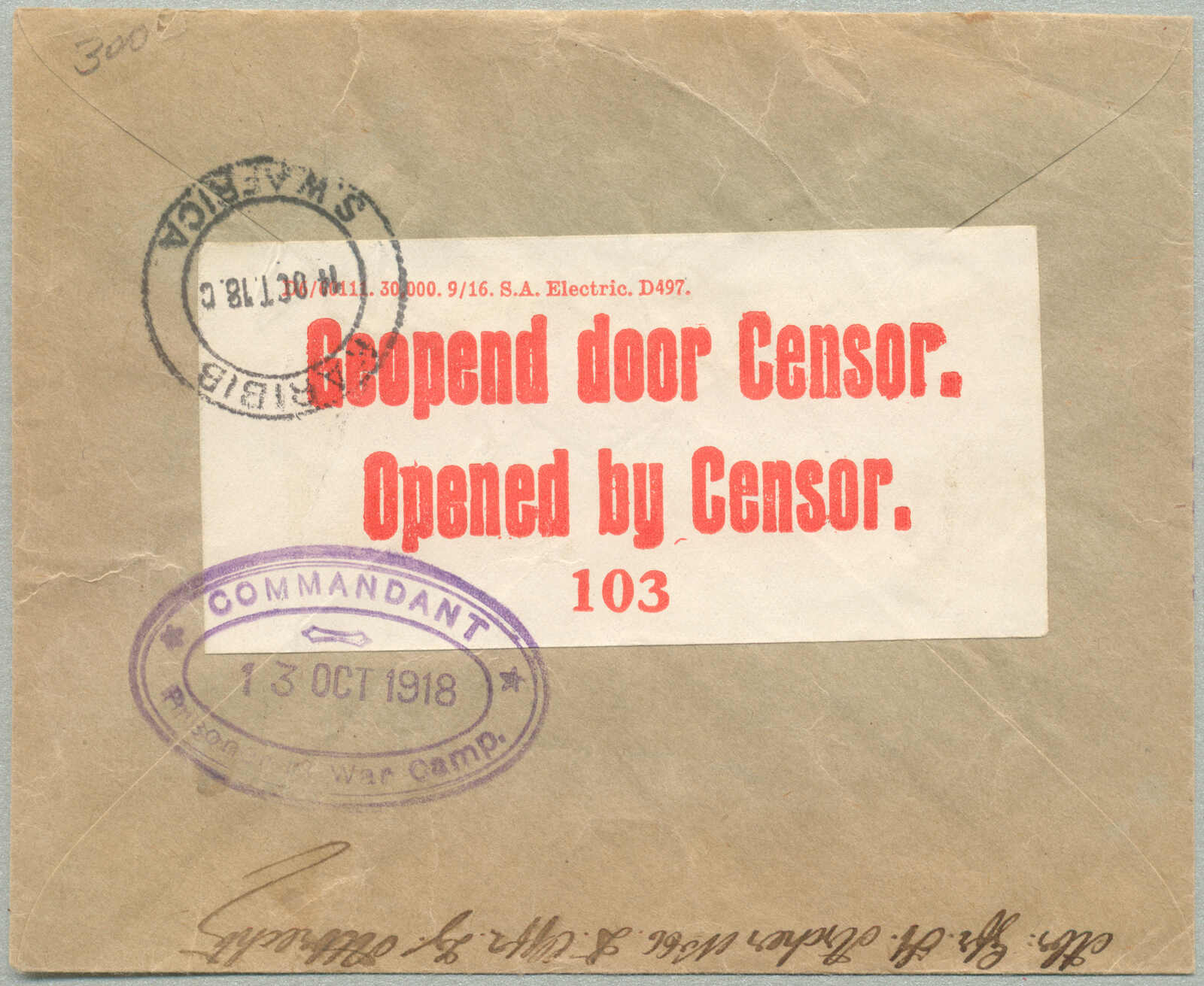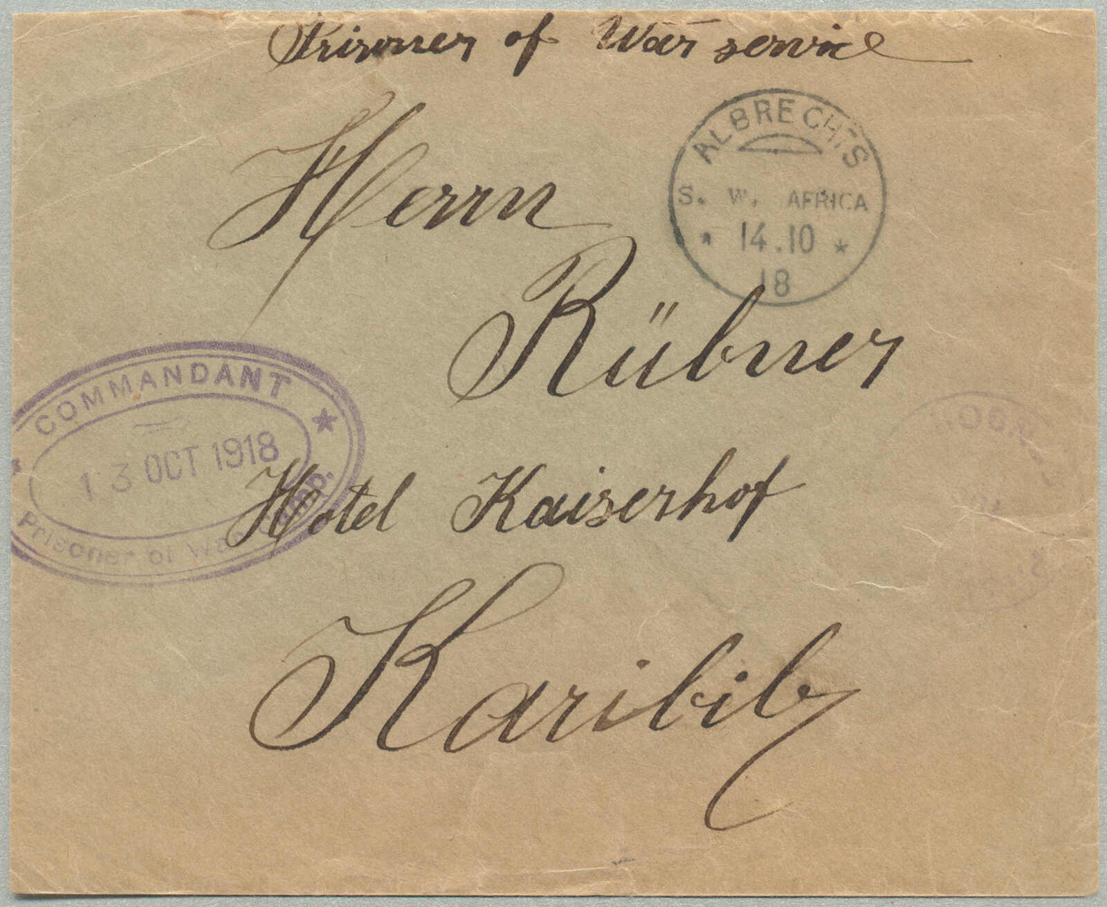 3373 on cover image1918, British Occupation of German Southwest Africa, Prisoner of War censored letter from camp in ALBRECHTS to Mr. Rübner in the Hotel Kaiserhof in KARIBIB, cancelled with ALBRECHTS/S.W.AFRICA/14.10/18, violet PASSED CENSOR and oval COMMANDANT/PRISONER OF WAR CAMP cachet, m/s Prisoner of war service at top, reverse with arrival and opened by censor label, ex Kugel, very scarce, desirable and historical referencing, sent during final phase of WWI hostilities in Africa, associated with the British military administration of South West Africa following the 1915 surrender of German colonial forces under Victor Franke, referencing British forces under General Louis Botha and Jan Smuts, ALBRECHTS POW camp served as a detention center for German military and civilian internees following the occupation of the colony, KARIBIB, a key railway junction and administrative center, hosted German colonial and later British occupation presence, Hotel Kaiserhof indicative of pre-war German infrastructure, rare usage from ALBRECHTS with intact censorship markings and legible postmark, philatelically significant for its linkage to British censorship and occupation postal history in former German colonies, ex Kugel, XF! Estimate 800€.