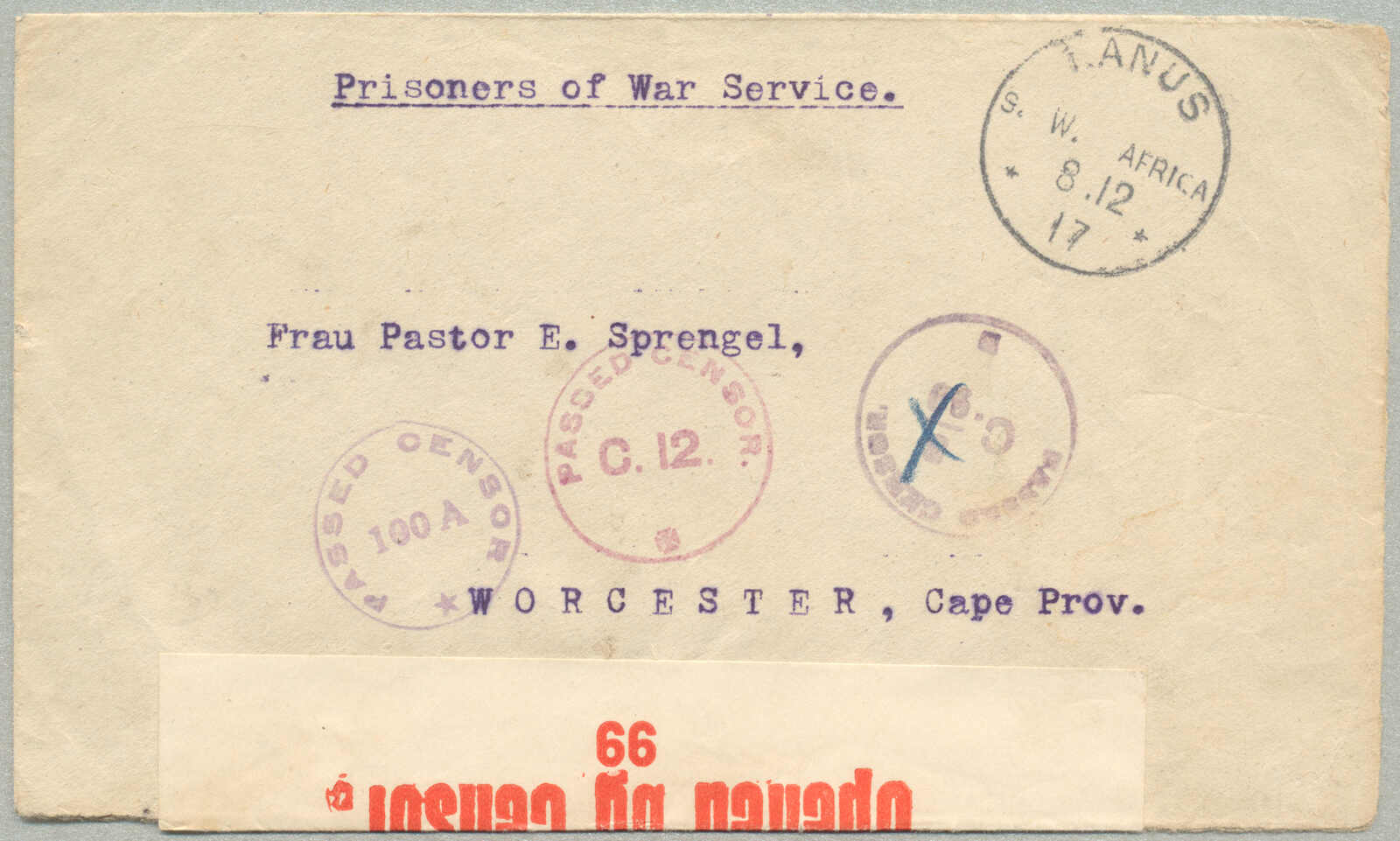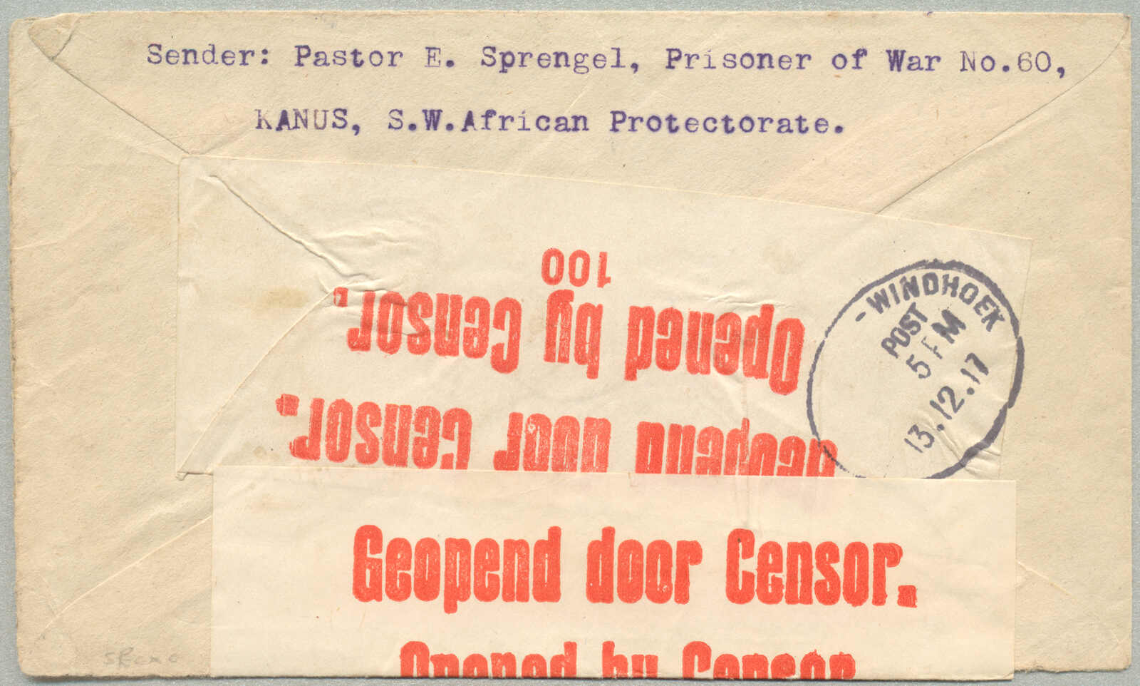 3370 on cover image1917, British Occupation of German Southwest Africa, Prisoner of War letter from KANUS/8.12/17 to WORCESTER/CAPE PROVINCE from Pastor Karl Sprencel – designated as POW Nr. 60 to his wife, dispatch KANUS, three (!) different violet PASSED CENSOR (100A, C.12. and C 5/90 crossed out), front and reverse with two labels Opened by Censor, arrival WINDHOEK, ex Kugel, very scarce, desirable and historical referencing, during the BRITISH OCCUPATION OF GERMAN SOUTHWEST AFRICA following the Union of South Africa’s military campaign in 1915 under General Louis Botha and General Jan Smuts, German nationals including clergy and civilians were interned. This cover, posted from KANUS (a minor internment location known for housing ecclesiastical personnel), bears a dispatch date of 8 DECEMBER 1917 and was sent to WORCESTER in the CAPE PROVINCE. The sender, PASTOR KARL SPRENCEL, Lutheran missionary and former parish priest in the Grootfontein district, was held as POW Nr. 60, postal censorship markings reflect a layered and evolving control process by the British military postal service, indicated here by three distinct violet PASSED CENSOR handstamps – rare in their combined presence. Notably, one censor mark (C 5/90) was later annulled, suggesting overlapping censorship jurisdictions or re-examinations. The dual Opened by Censor tape labels on both front and reverse reinforce this, the letter's transit via WINDHOEK, then under British administrative control, signifies the integrated postal routes maintained for internees' communication – a remarkable continuity under wartime governance, a compelling intersection of postal history, imperial military administration, and the personal cost of global conflict – this item also serves as a testimonial to the overlooked fate of missionary personnel caught between empires, ex Kugel collection, renowned for its high-caliber German colonial postal history, with strong interest from collectors of British Occupation Issues, German Colonies, and WWI Postal History, ex Kugel, XF! Estimate 3.000€.