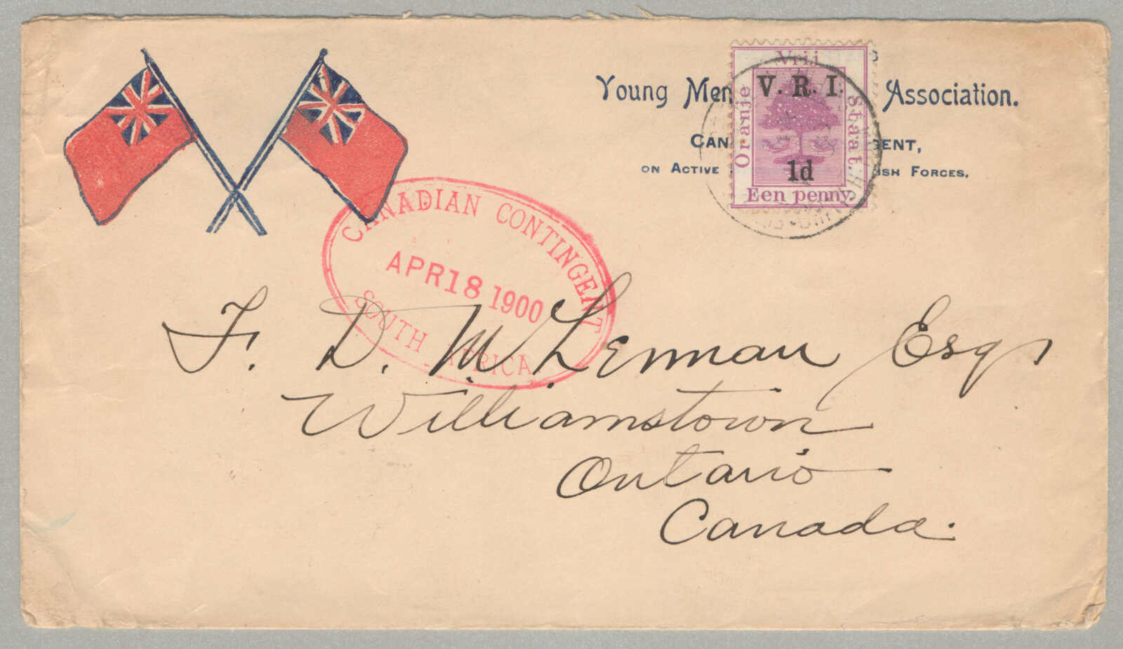 1900, von Südafrika zu Williamstown, Ontario, Kanada, Briefumschlag von einem kanadisch Soldat dienend im Burenkrieg, gesendet über kanadisch Kontingent Südafrika oval Feldpoststempel in rot datiert April 18 1900, freigemacht mit orangem Freistaat 1d lila überdruckt V. R. I. 1d in schwarz, übergehend gestempelt mit Feld Stempel, Briefumschlag mit gedrucktem YMCA Eindruck Jung Mens Christlicher Verband - kanadisch abhängig von Felddienst mit den Briten Gewalten, Vaterländische design mit durchquerten rot Ensign Fahnen, selten Burenkrieg Feldpost ab kanadisch Alles hört auf mein Kommando benutzen überdruckt Besetzungsausgabe während frühe Zustand von Britisch Militär Kontrolle in orange Freistaat, ex Kugel, Kabinett! Schätzpreis 700 EUR.