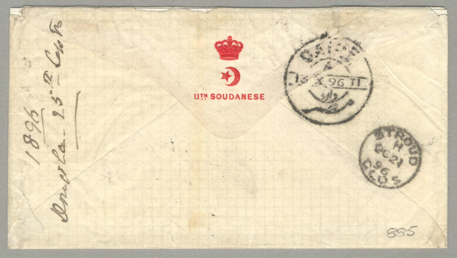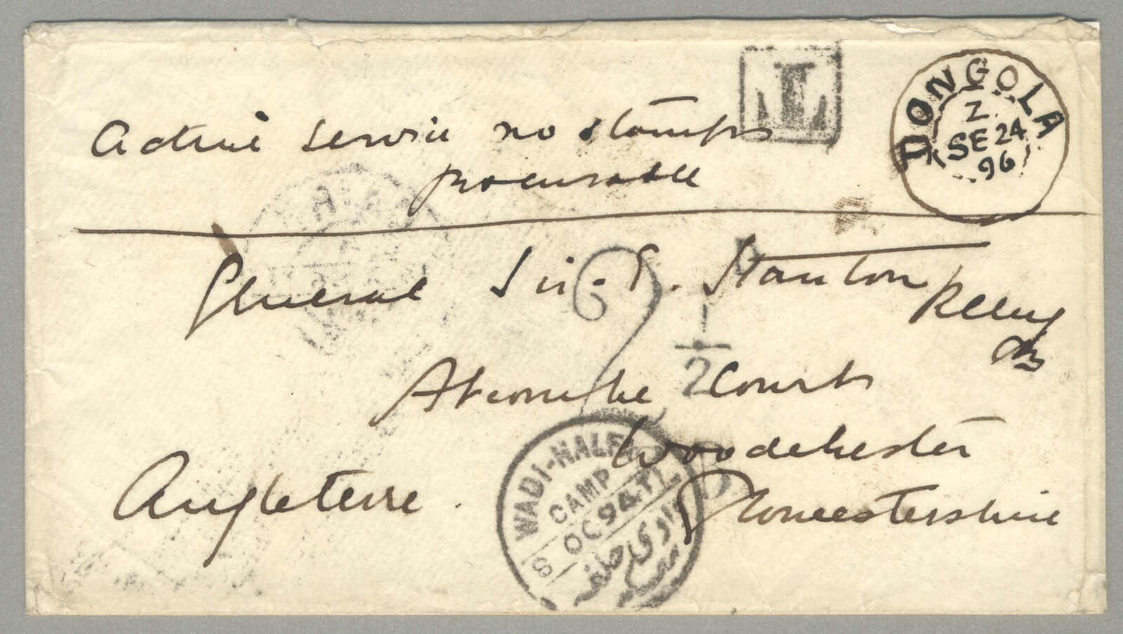 3398 on cover image1896, from Dongola during the British Nile Expedition, military envelope endorsed Active Service no stamps available, dated handdrawn cancel DONGOLA SE 24 96, the day after British forces captured the town in their campaign against the Mahdist regime, entered the mails at WADI HALFA CAMP 9 OC 96 two weeks later, red unit cachet on reverse reading 11TH SOUDANESE, part of the British effort to reestablish control in the Sudan after the fall of Khartoum, this cover represents one of the earliest postal artifacts from the 1896 advance up the Nile under Kitchener, combining both immediate military context and delayed postal processing under field conditions, ex Kugel, VF! Estimate 1.000€.