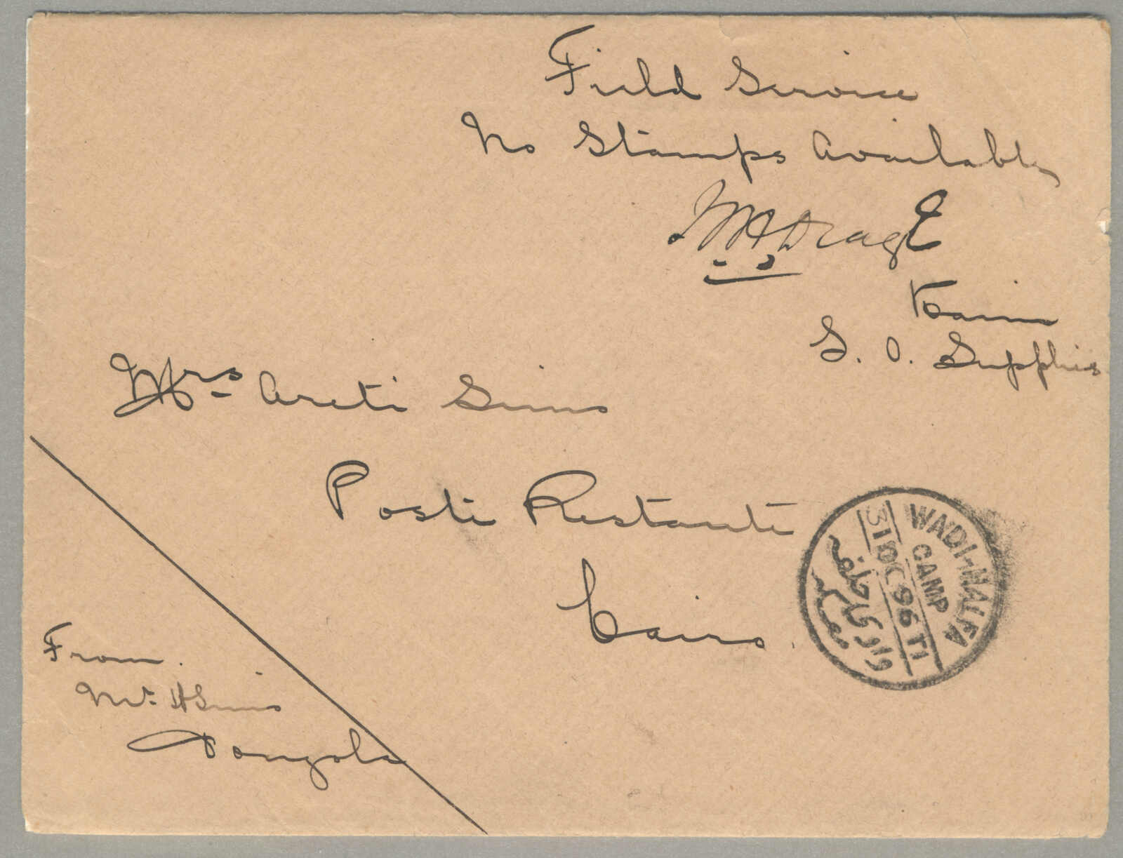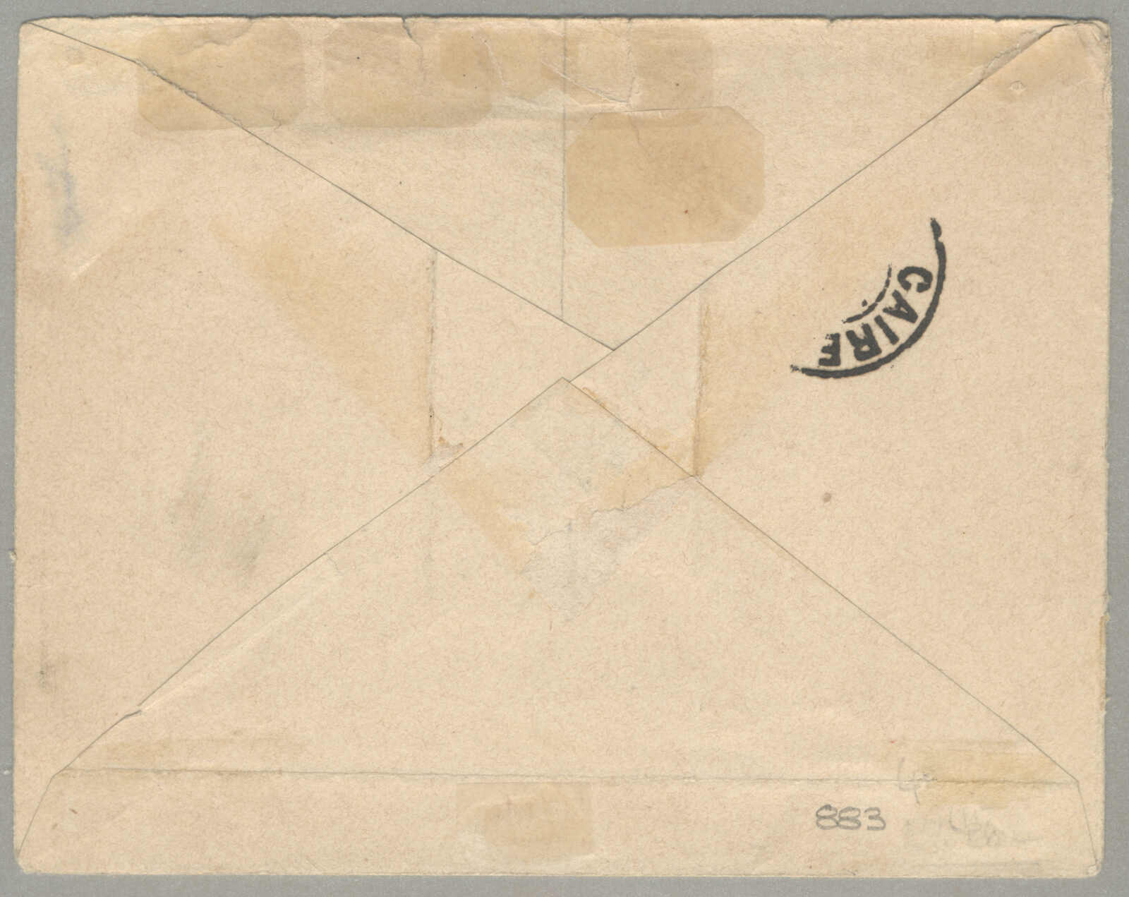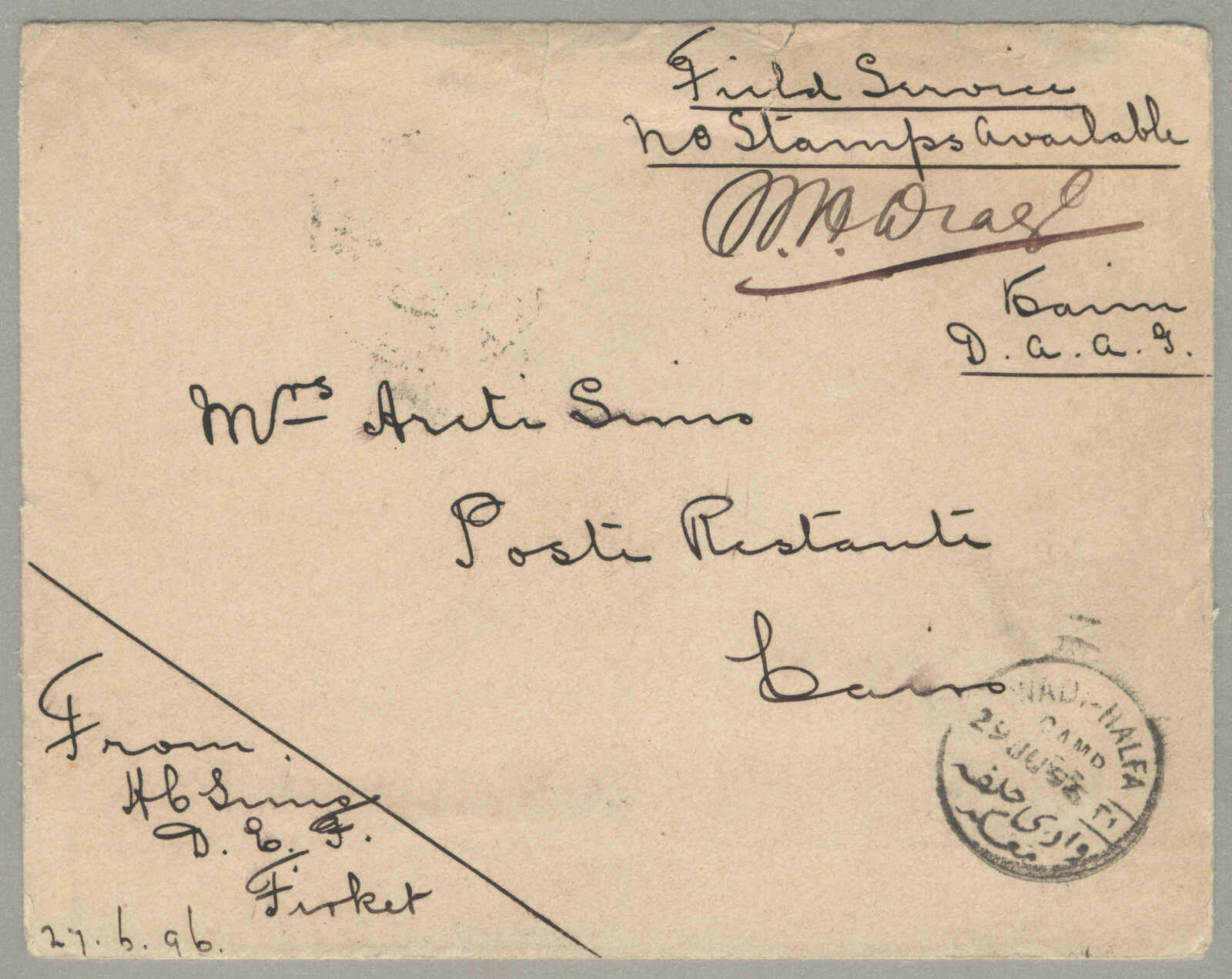 3397 on cover image1896, from Firket, Sudan to Cairo, Egypt, field service envelope endorsed Field Service no stamps available, written and signed by a British supply officer, dated 27 6 96 at lower left, routed via Wadi Halfa, where it received the WADI HALFA CAMP 29 JU 96 cds, carried during the early phase of the British Nile Expedition aimed at retaking Sudan from Mahdist control, Firket served as the British base camp in northern Sudan and was used as a launching point for the advance on Dongola and later Khartoum, this cover is one of the earliest known from the field, written before Dongola was taken and posted via the military post system, highly significant military history usage, ex Kugel, XF! Estimate 1.000€.