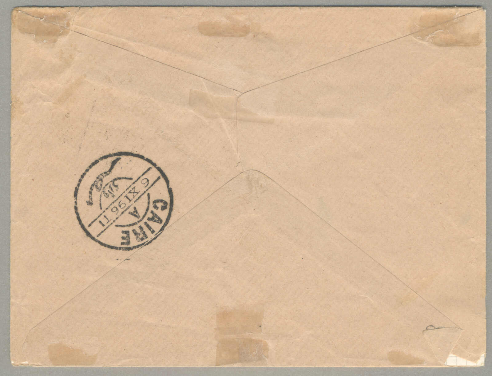 3396 on cover image1896, from Dongola Sudan to Cairo Egypt, field service envelope endorsed Field Service no stamps available, written and signed by a British supply officer, dateline at lower left reads Dongola, routed via Wadi Halfa, where it entered the mails and received a clear WADI HALFA CAMP 31 OC 96 cds, Sudan was ruled by a Mahdist theocracy from 1881 until British forces began their reconquest from Egypt in 1896, Dongola was captured on 23 September 1896 and used as an advanced base for the assault on Khartoum, this cover reflects the delayed transmission of field correspondence via the British military postal system, originating from occupied Dongola and entered into the mail stream over a month later at Wadi Halfa, significant military campaign usage from the Nile Expedition, ex Kugel, XF! Estimate 1.000€.