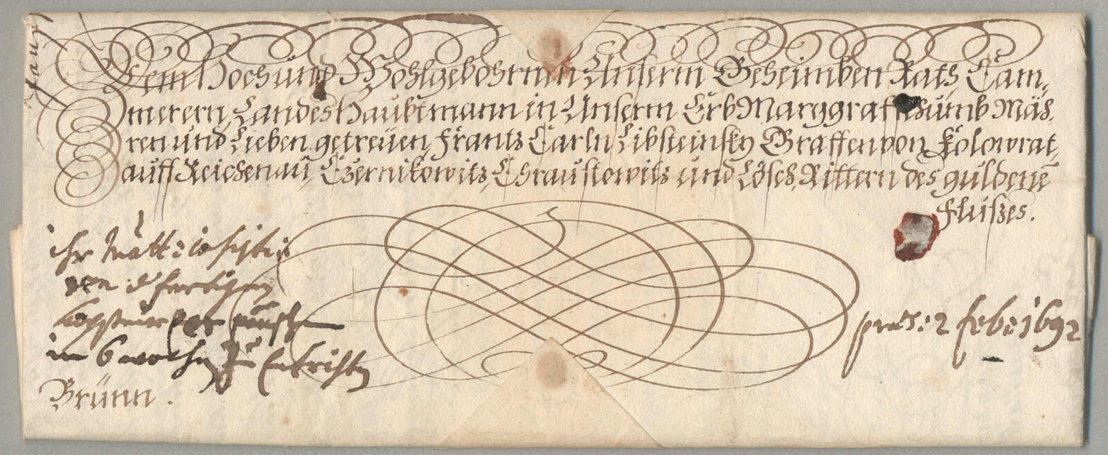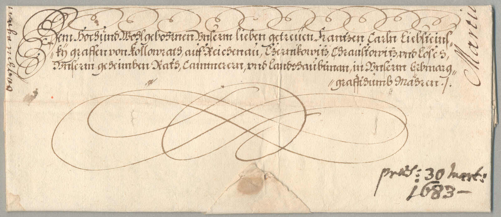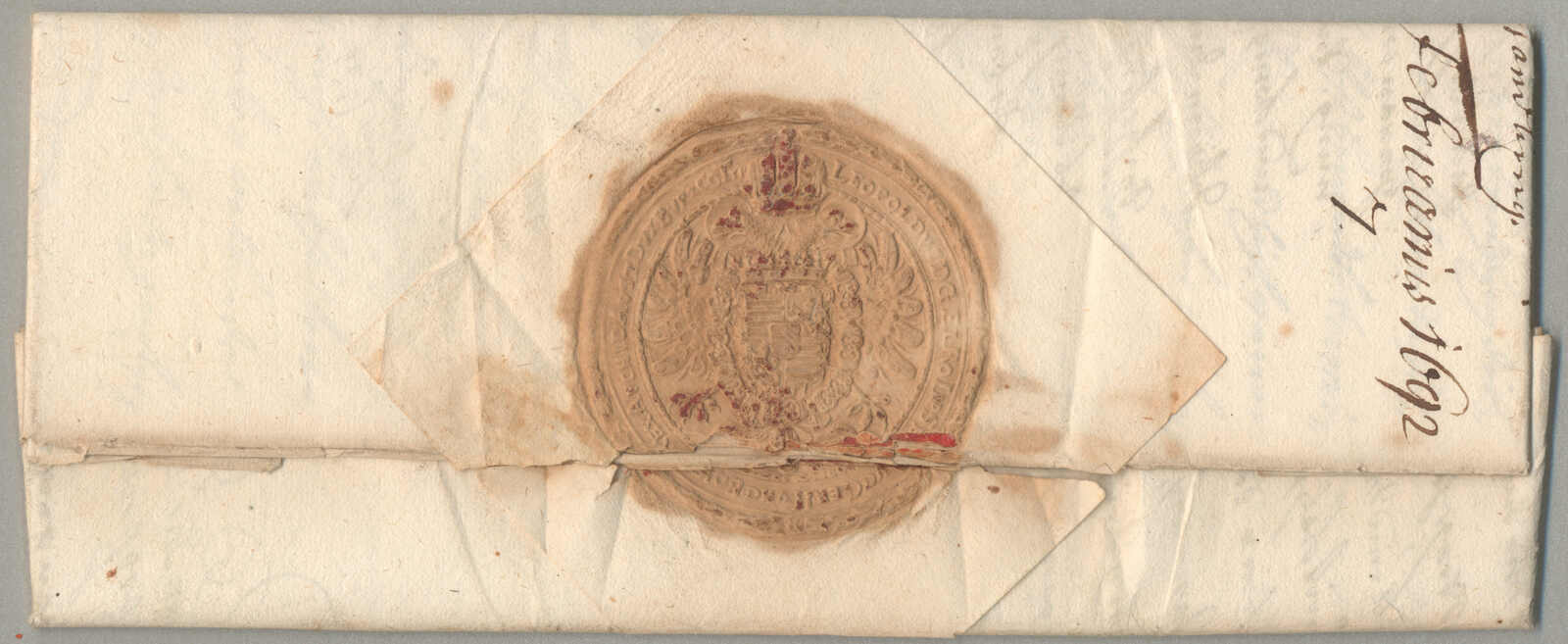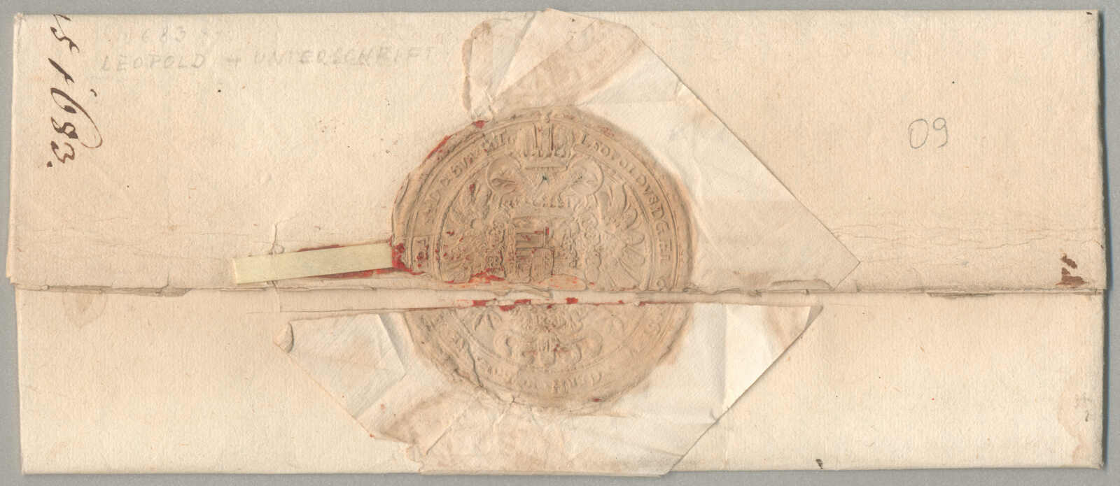 1023 on cover image1690, from Wien to Brünn, complete folded letter signed in full by Emperor Leopold I, addressed to the Moravian Landeshauptmann Franz Karl Liebstainsky von Kolowrat auf Reichenau, reprimands the Moravian estates for only having paid 4200 Gulden out of the 40000 Gulden owed to the imperial war treasury, requests immediate action to collect the remaining funds, written in chancery hand on large-format imperial paper, features intact large paper seal on reverse with imperial coat of arms, datelined 8 March 1690, issued during the later phase of the Second Turkish War which followed the failed Ottoman siege of Vienna in 1683 and marked a decisive shift in the Habsburg campaign against Ottoman forces, reflects the continuing fiscal and administrative pressure on provincial estates to sustain the military advance into Hungary and the Balkans, this document highlights how imperial authority enforced war financing through regional leadership, XF! Estimate 2.400€.