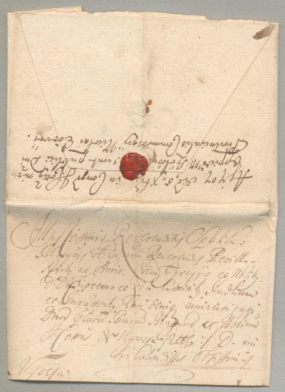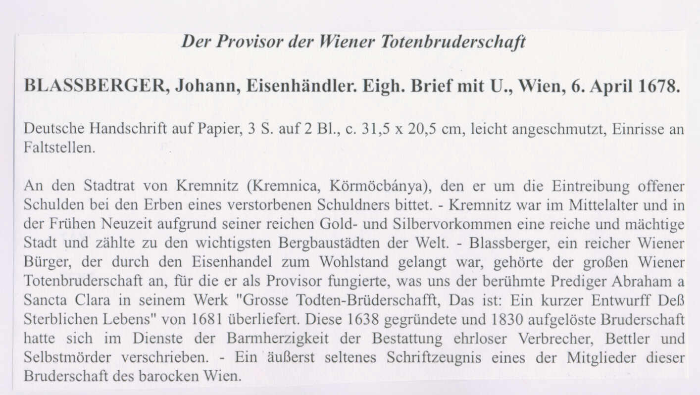 1037 on cover image1678, from Vienna to Kremnitz present day Kremnica Slovakia, folded letter sealed with red wax seal showing ecclesiastical emblem, dated 6 April 1678, sent by Johann Blassberger Viennese ironmonger and acting procurator of the Wiener Totenbruderschaft, addressed to the city council of Kremnitz, requests collection of outstanding debts from the heirs of a deceased debtor, written in German chancery hand, reflects charitable efforts by the Totenbruderschaft founded in 1638 and dissolved in 1830 dedicated to the burial of criminals beggars and suicides, document highlights the legal and financial operations of this unique baroque fraternity which combined religious piety with practical municipal responsibilities, Kremnitz at the time was one of the major gold and silver mining centers in Central Europe and a key financial hub in the Kingdom of Hungary, rare example of early modern social religious administration involving cross border debt enforcement, VF! Estimate 1.200€.