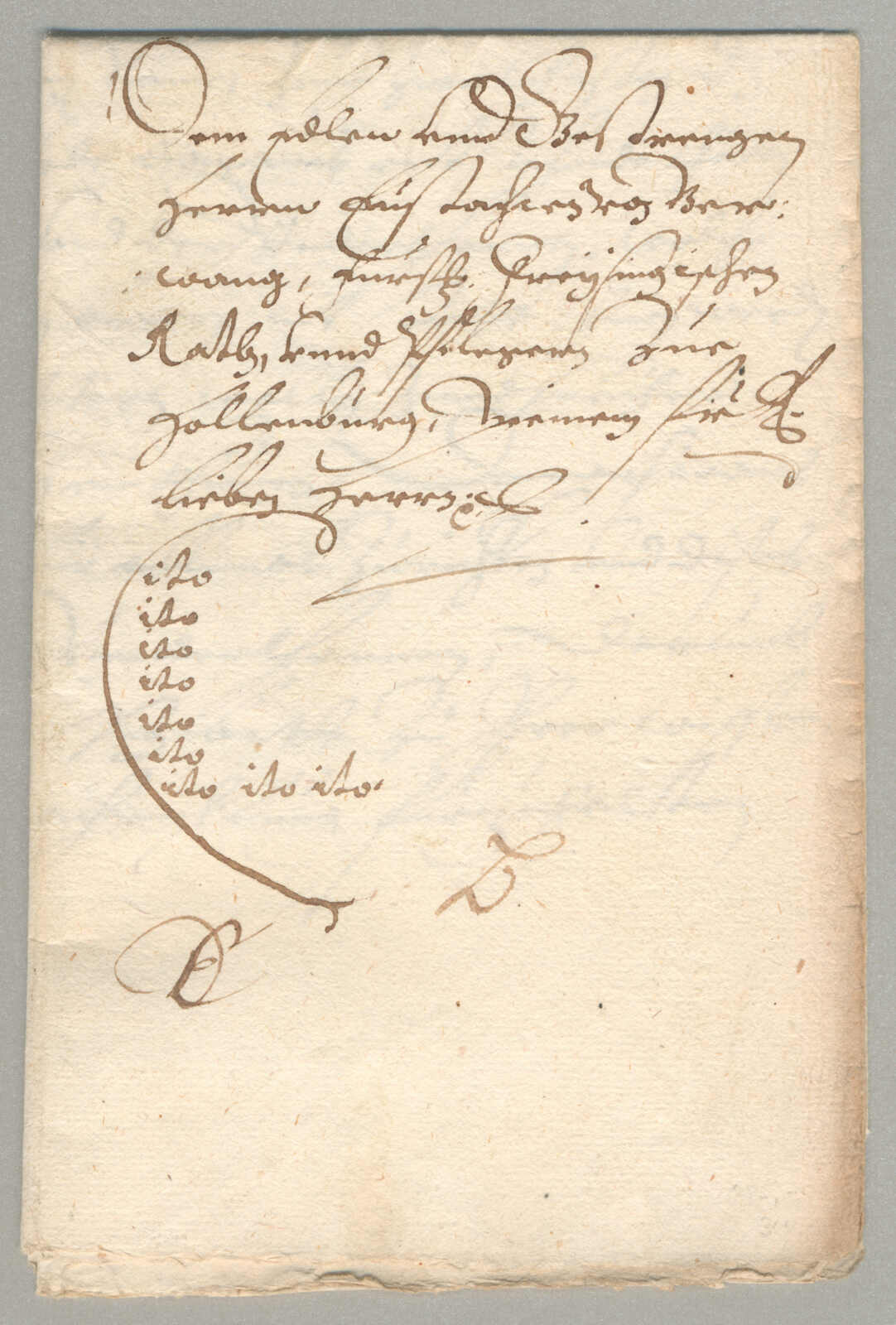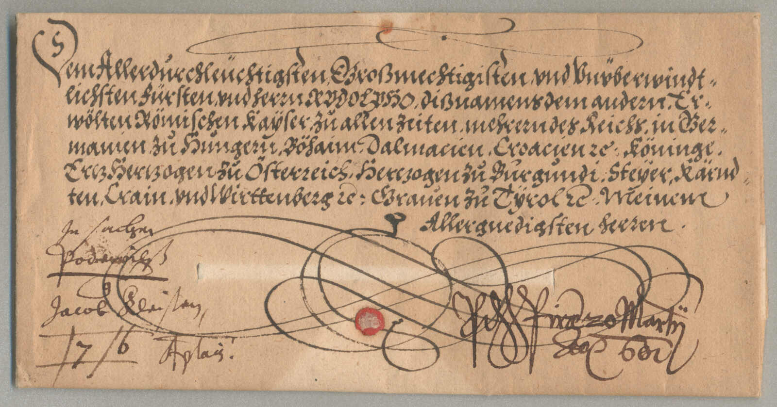 1035 on cover image1601, from Stettin to Emperor Rudolf II in Prague, princely letter sent by Duke Barnim X of Pomerania, folded letter with ornate calligraphic address in dark chancery script and intact red wax seal, dated 20 March 1601, official ducal communication concerning a legal dispute titled in Sachen Podewils contra Kleisten, carried by mounted courier, decorative office note on front and back, including MANUPROPRIA SUSKRIPSI confirming the personal authorship and authority of the signer, typical of early 17th-century high court diplomatic protocol, sent during the later reign of Emperor Rudolf II whose rule was marked by political paralysis, religious tension and the rise of proto-confessional states within the Holy Roman Empire, Pomerania under Duke Barnim X maintained Protestant sovereignty while balancing imperial obligations, rare example of formal princely chancery correspondence with legal content and high representational character, VF! Estimate 1.000€.